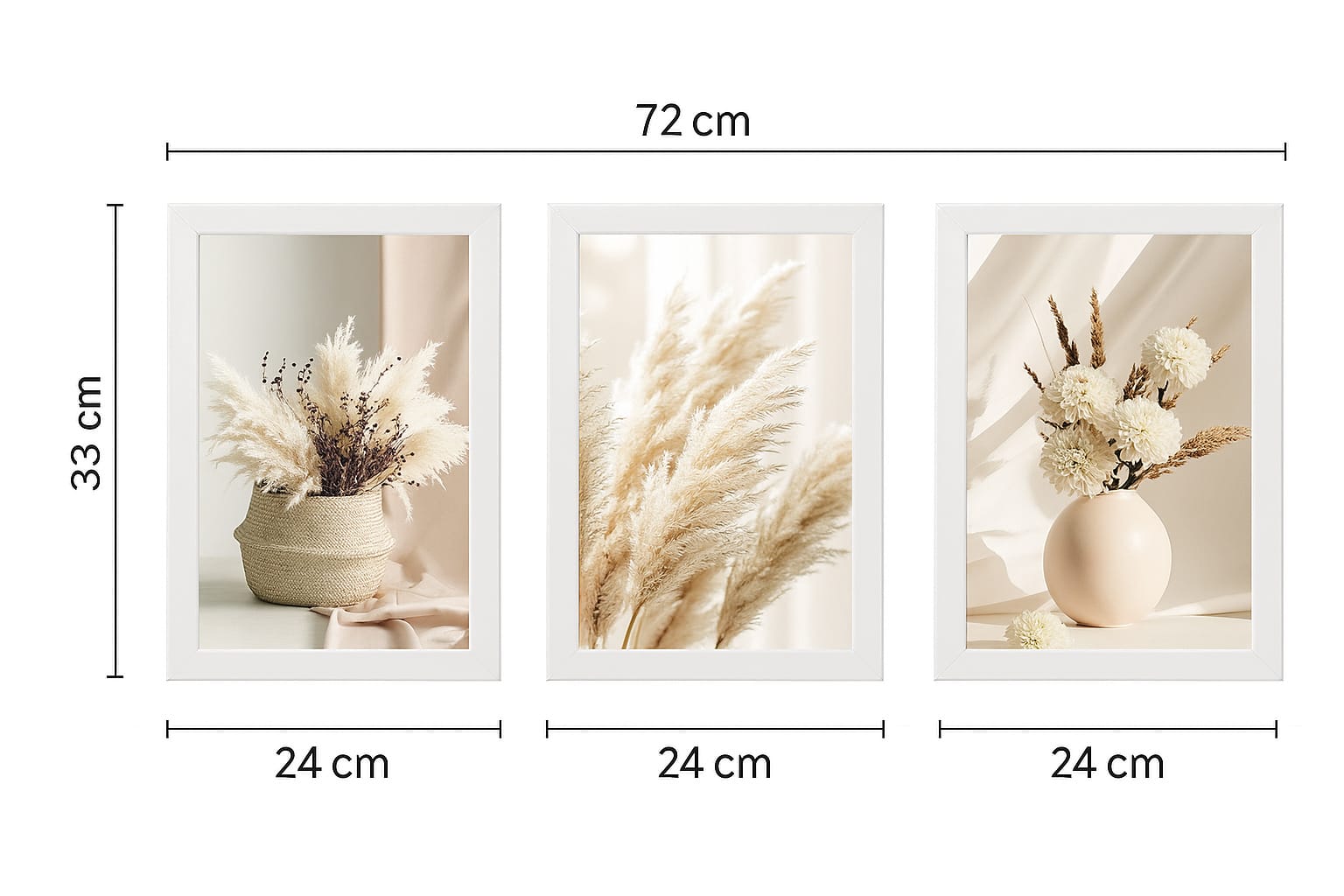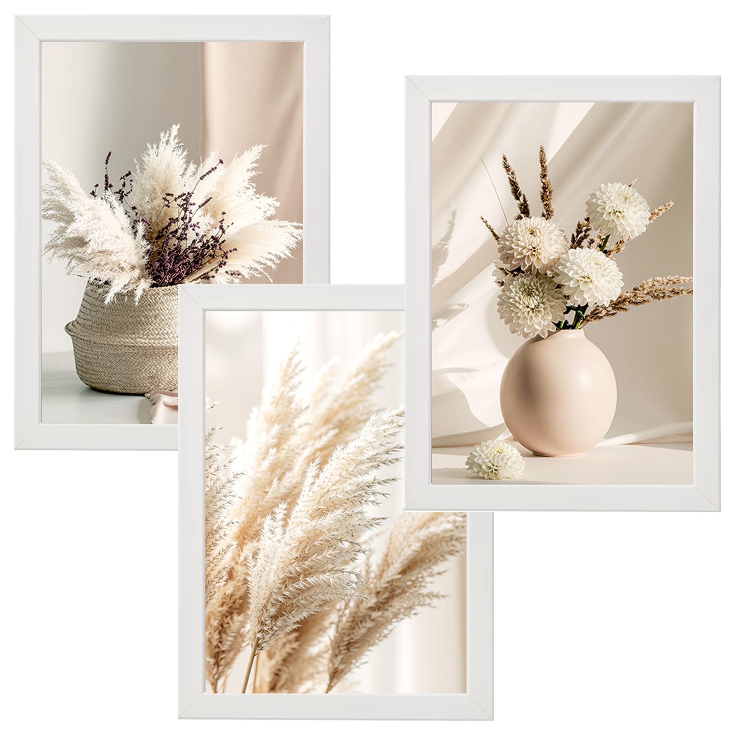 Zestaw 3 plakatów „Puszyste boho” – trawy pampasowe, białe kwiaty i naturalne tekstury