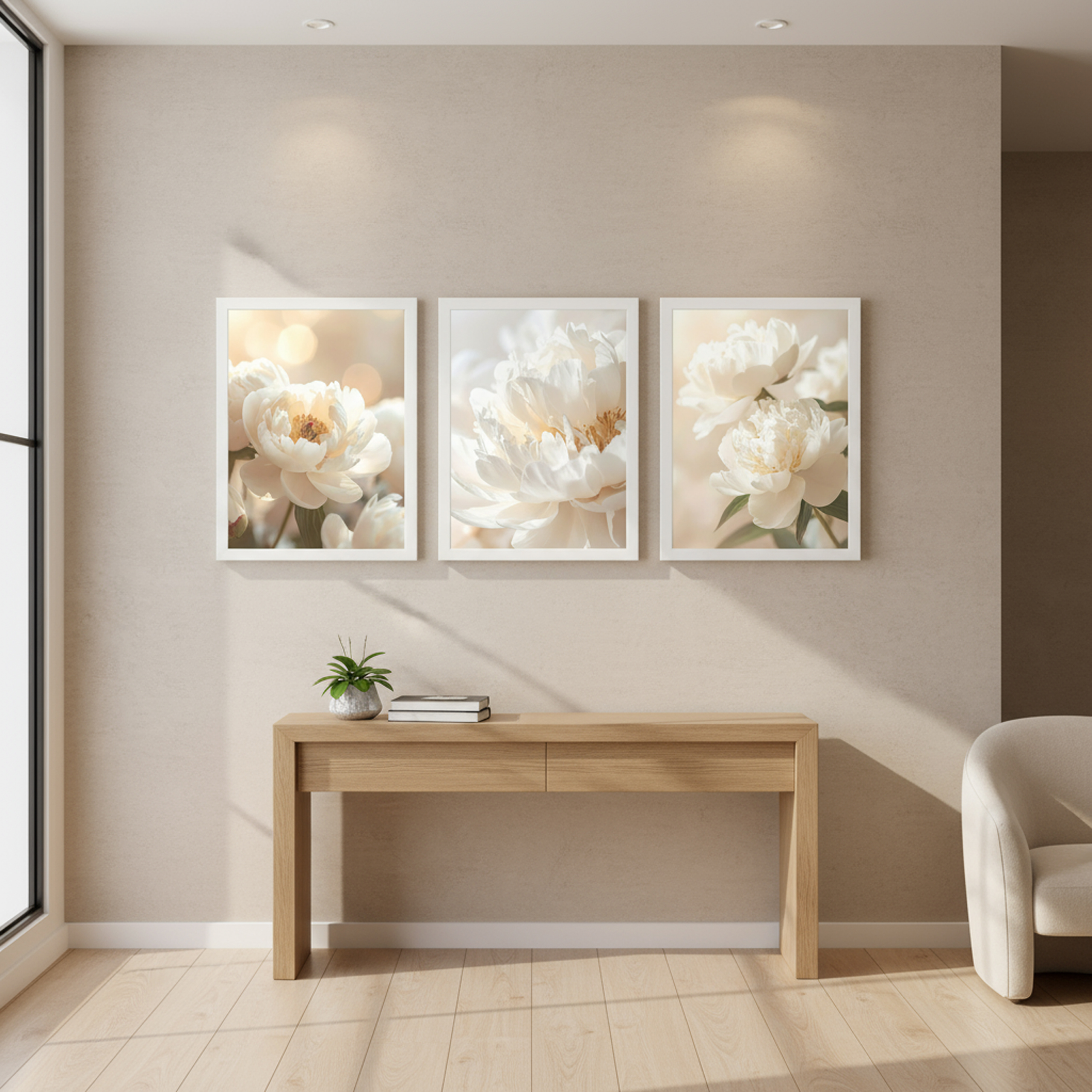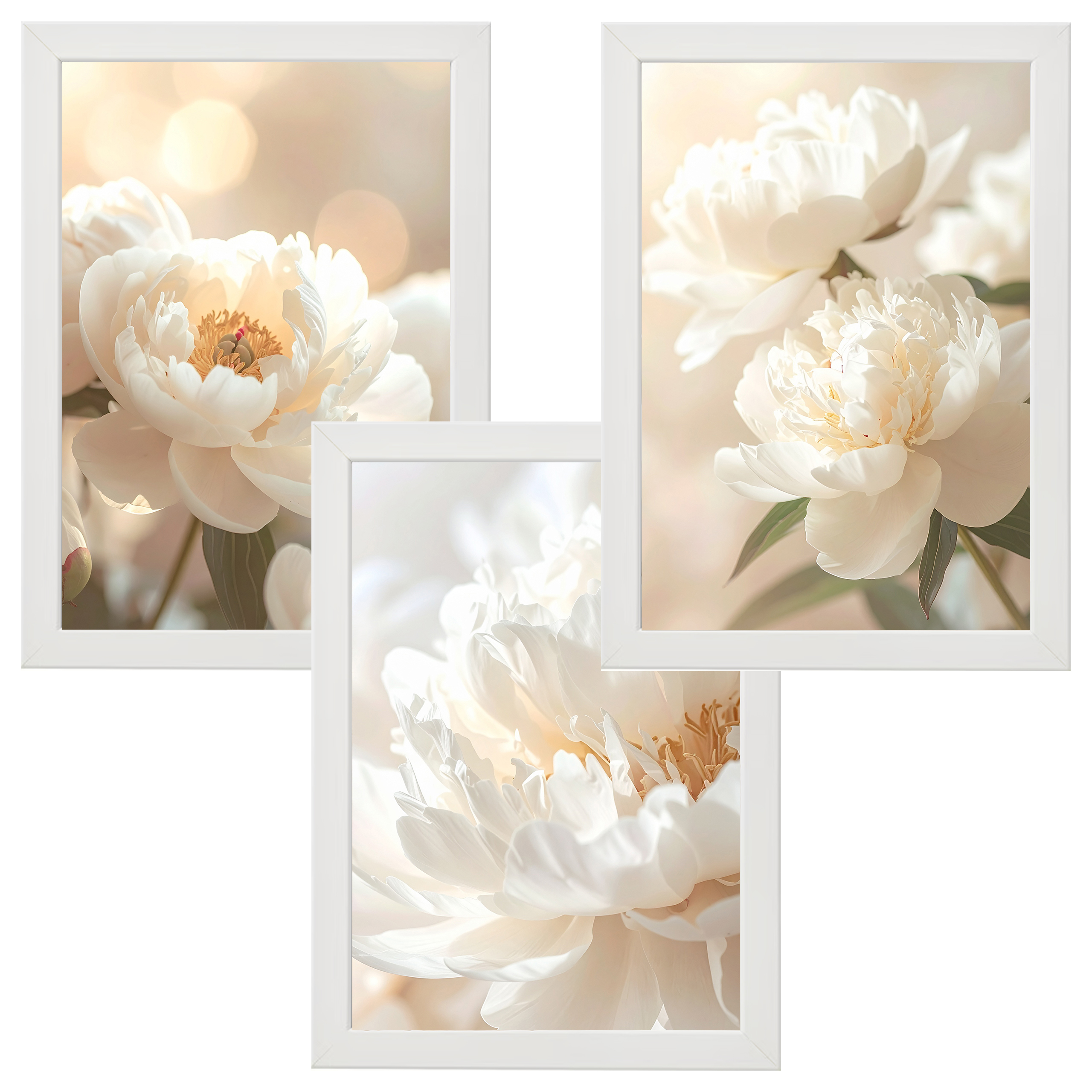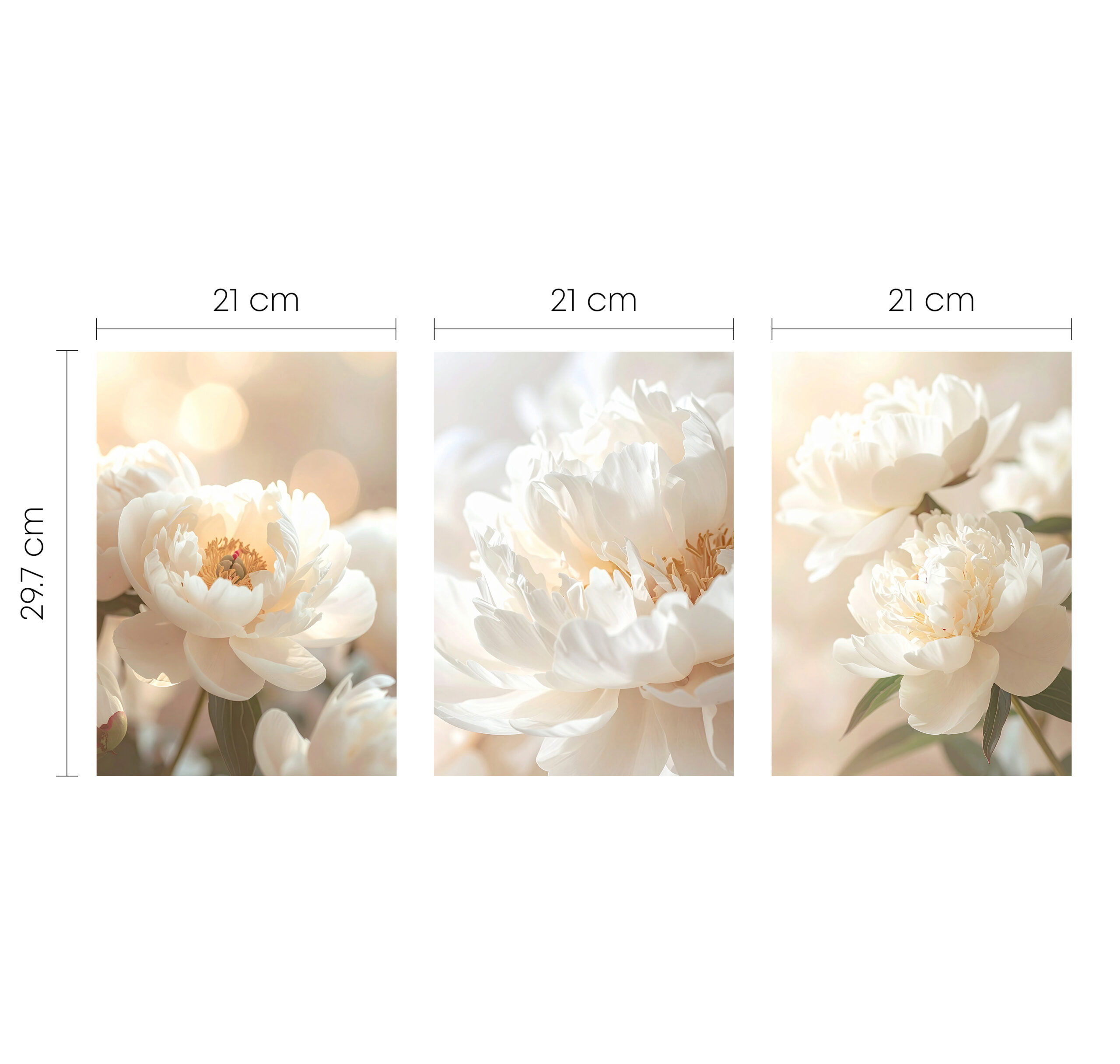 Zestaw trzech plakatów przedstawiających delikatne białe piwonie w miękkim świetle. Idealna dekoracja ścienna do salonu, sypialni lub biura. Wnosi do wnętrza harmonię, spokój i ponadczasową elegancję.