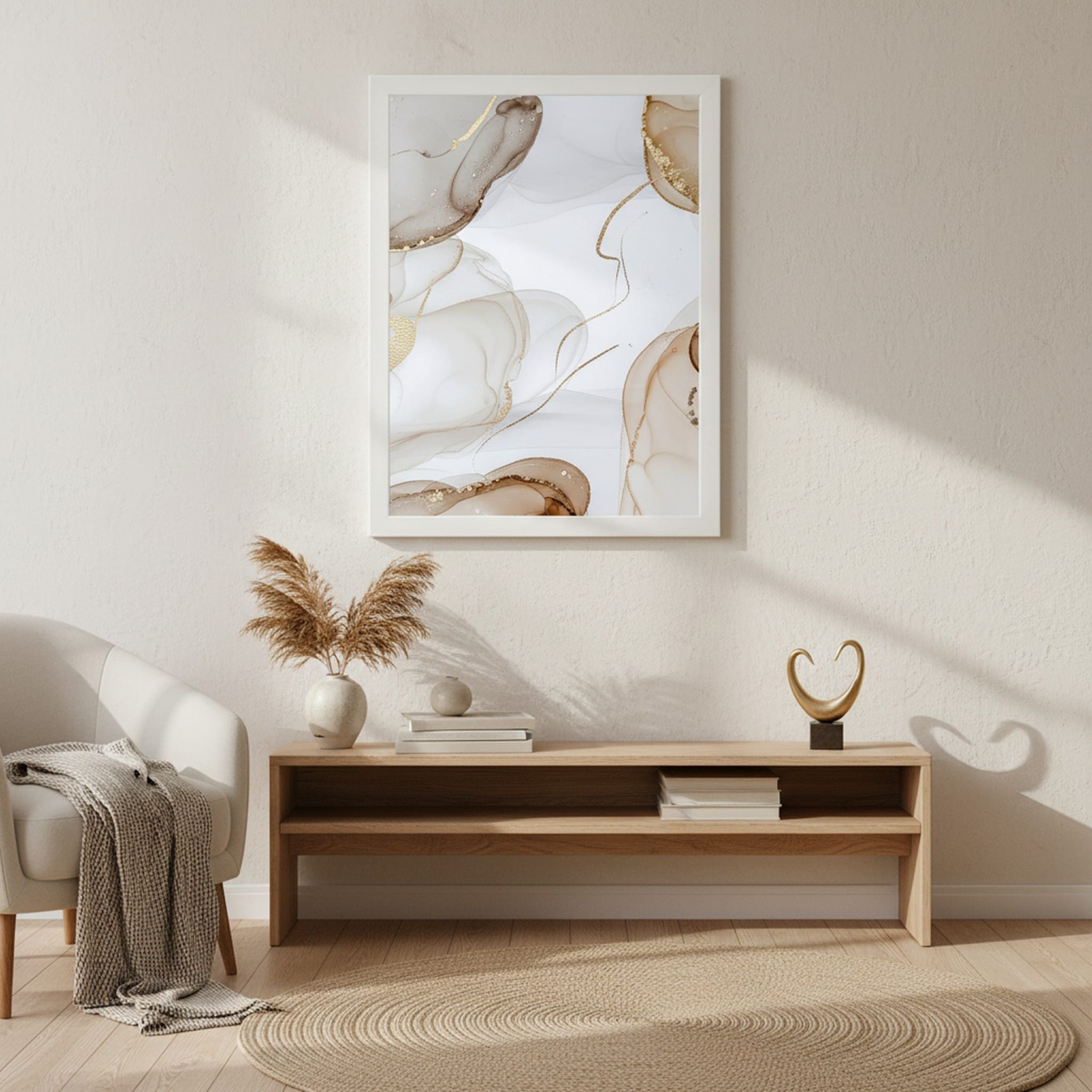 Nowoczesna sztuka potrafi nadać wnętrzu duszę, a „Złoty Piasek” robi to w sposób niezwykle elegancki. Grafika ta nawiązuje do struktur naturalnego kamienia, ale przedstawia je w miękkiej, niemal eterycznej formie. Warstwowe przenikanie się barw ziemi z czystą bielą tła tworzy poczucie głębi i spokoju. To doskonały wybór dla osób, które kochają styl Glamour, ale szukają jego łagodniejszej, bardziej przytulnej odsłony. Złote detale pięknie pracują ze światłem, sprawiając, że plakat zmienia swoje oblicze w zależności od pory dnia.