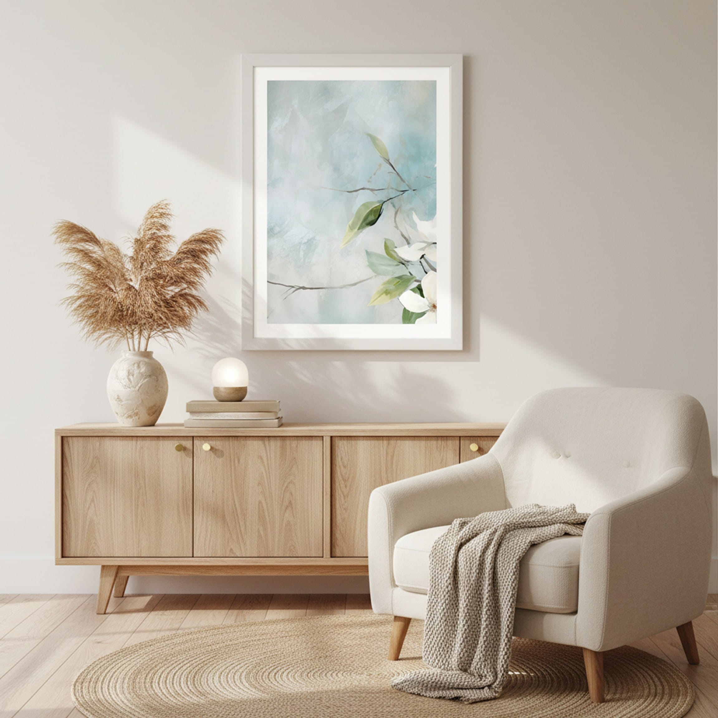 Odkryj potęgę minimalizmu inspirowanego naturą. Plakat „Błękitna Magnolia” to subtelna kompozycja, w której malarskie tło w kolorze morskiej mgły spotyka się z delikatnymi detalami roślinnymi. Dzięki swojej eteryczności i chłodnej palecie barw, grafika ta działa kojąco i optycznie powiększa każde pomieszczenie. Idealny wybór do sypialni, łazienki lub salonu w stylu Modern Classic. Wydruk klasy premium na papierze Luster 260g.