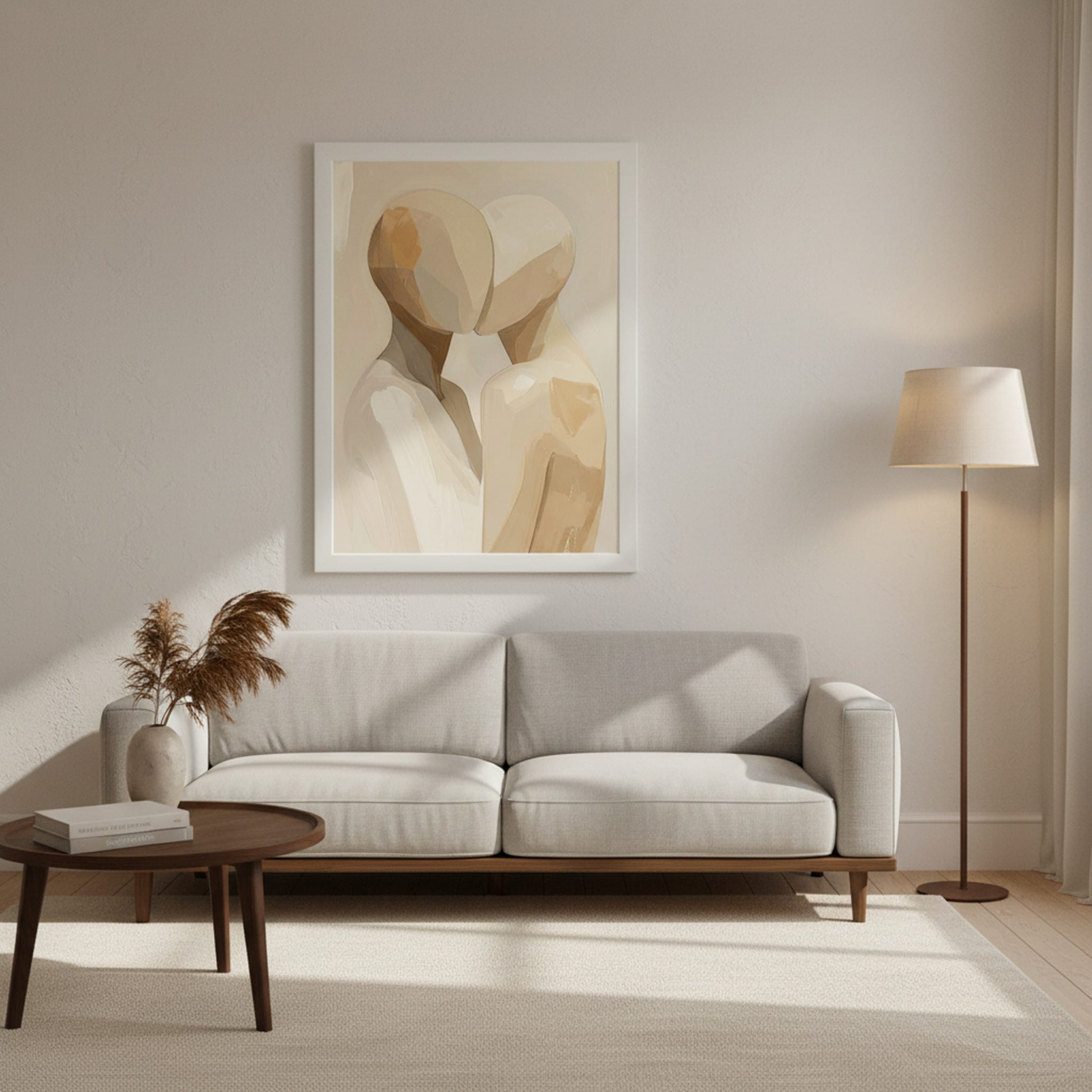 Poszukujesz dekoracji, która nada wnętrzu głębi i osobistego charakteru? „Bliskość” to artystyczna interpretacja więzi, ujęta w ramy nowoczesnej abstrakcji. Zamiast detali, artysta postawił na grę światła, cienia i tekstury, używając zdecydowanych pociągnięć pędzla, które tworzą niemal trójwymiarowe bryły postaci. Neutralna kolorystyka sprawia, że plakat ten staje się eleganckim tłem dla codzienności, nie przytłaczając wnętrza, lecz subtelnie definiując jego styl.