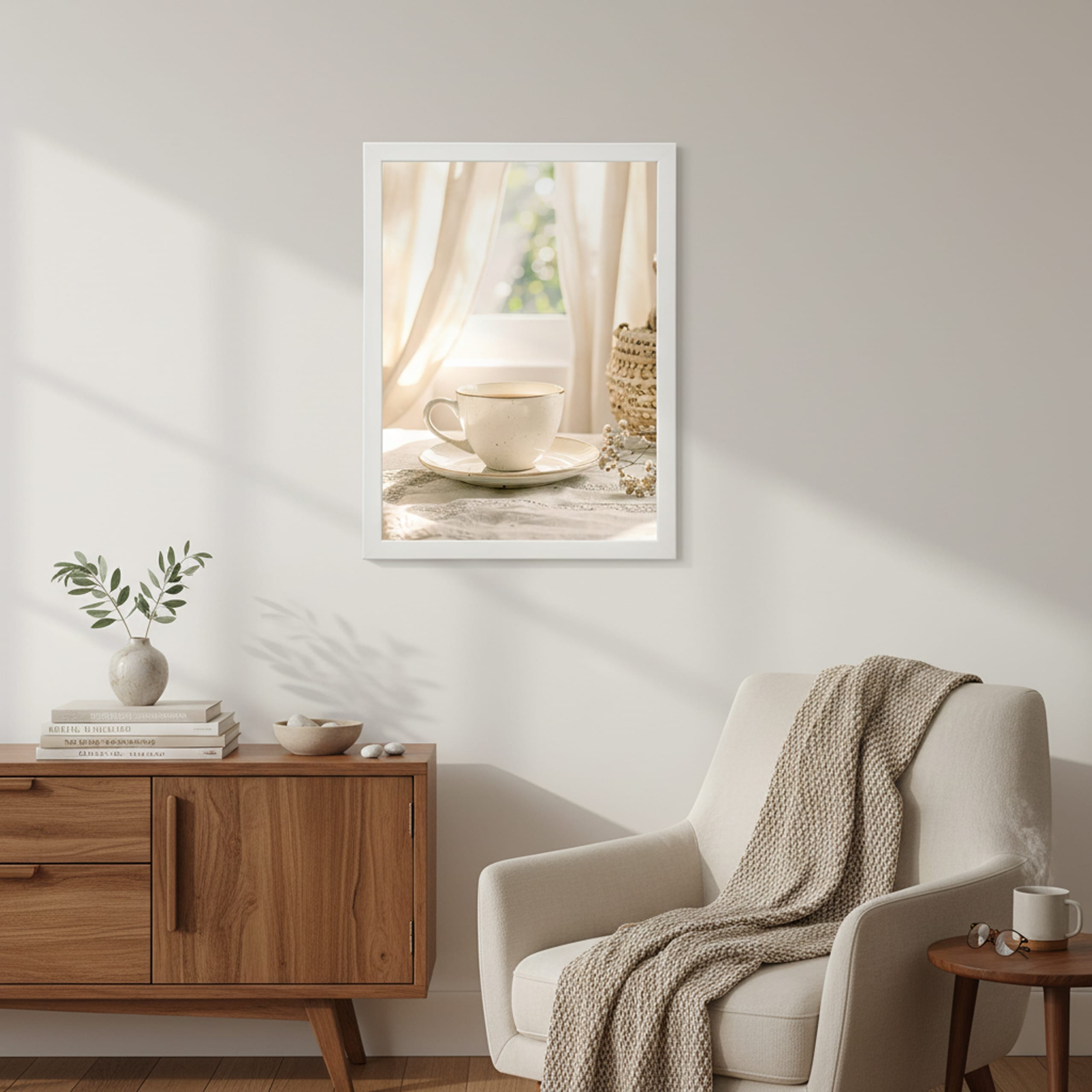 Piękno tkwi w prostych rytuałach. Plakat „Chwila Wytchnienia” to artystyczny zapis porannej uważności. Centralnym punktem jest klasyczna, ceramiczna filiżanka, której towarzyszą delikatne kwiaty i pleciony koszyk, a całość dopełniają zwiewne zasłony filtrujące słońce. Ta grafika nie tylko zdobi ścianę, ale wprowadza do wnętrza kojącą energię, przypominając o wartości odpoczynku. Doskonale wpisuje się w estetykę Japandi, Boho oraz klasyczne, jasne aranżacje.