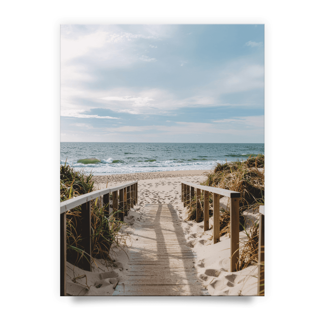 Wprowadź do swojej przestrzeni element, który codziennie będzie przypominał o wolności i szumie fal. „Zejście na Plażę” to kadr, który zachwyca autentycznością – od drobinek piasku na drewnianych deskach po delikatne chmury na błękitnym niebie. Perspektywa prowadząca w głąb obrazu sprawia, że plakat optycznie powiększa pomieszczenie, nadając mu lekkości i wakacyjnego charakteru. To dekoracja stworzona dla miłośników stylu Hamptons, Scandi oraz nowoczesnej estetyki bliskiej naturze.