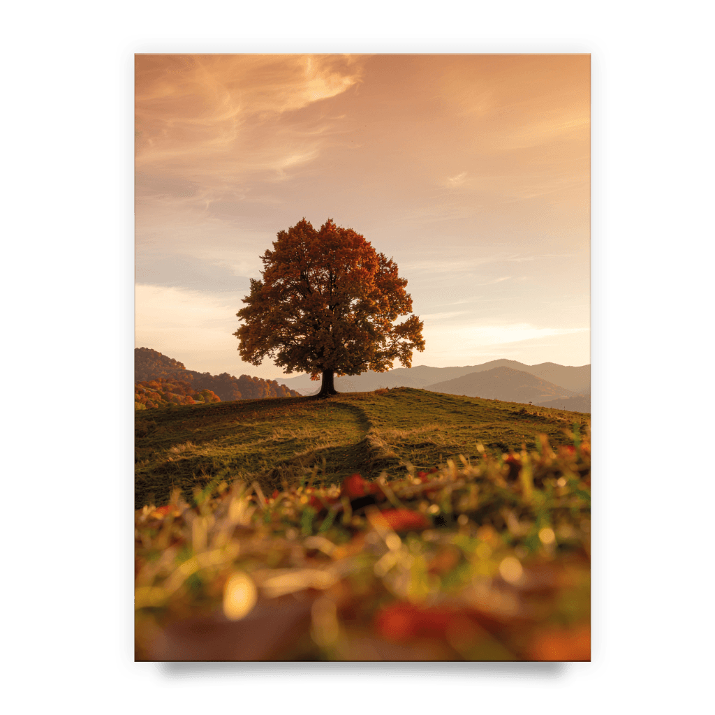Niektóre widoki zapierają dech w piersiach i zostają w pamięci na dłużej. „Złota Godzina” to plakat, który przenosi ten ulotny moment prosto na Twoją ścianę. Centralnie umieszczone, rozłożyste drzewo w jesiennej szacie staje się punktem centralnym wnętrza, a daleki plan z łagodnymi pasmami gór dodaje kompozycji głębi. To idealna propozycja dla miłośników pejzaży, stylu Natural Modern oraz wnętrz, które mają być oazą relaksu.