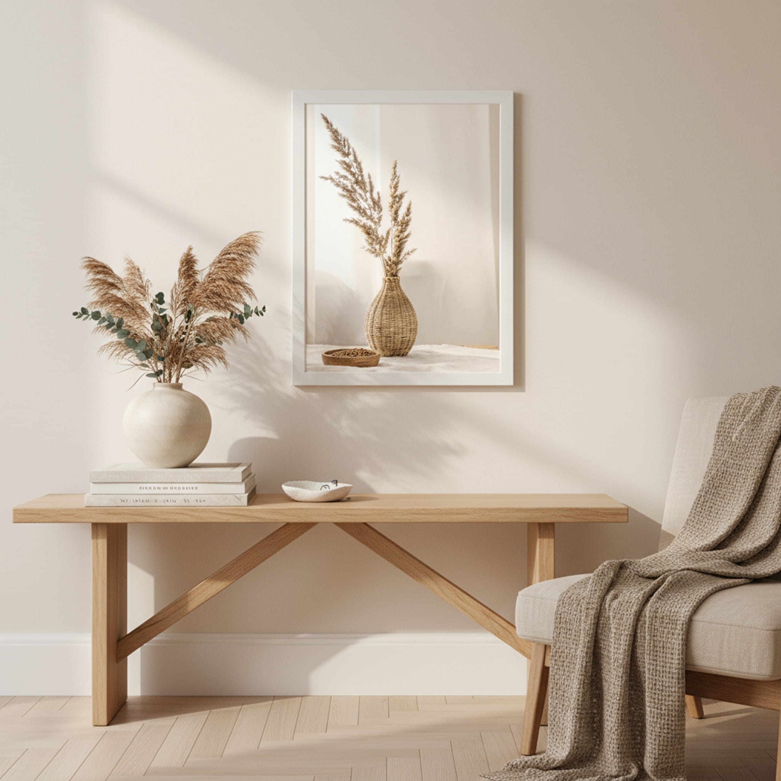 Współczesne wnętrza poszukują powrotu do korzeni. „Złote Kłosy” to kadr, który łączy tradycyjne rzemiosło z minimalistyczną estetyką. Drewniana miseczka wypełniona ziarnem oraz lniany obrus w tle dopełniają kompozycję, tworząc spójną opowieść o bliskości z naturą. Dzięki miękkiemu, rozproszonemu oświetleniu, plakat ten emanuje ciepłem, sprawiając, że każda przestrzeń staje się bardziej przytulna. To idealny wybór dla miłośników stylu Farmhouse, Boho oraz ekologicznego designu.
