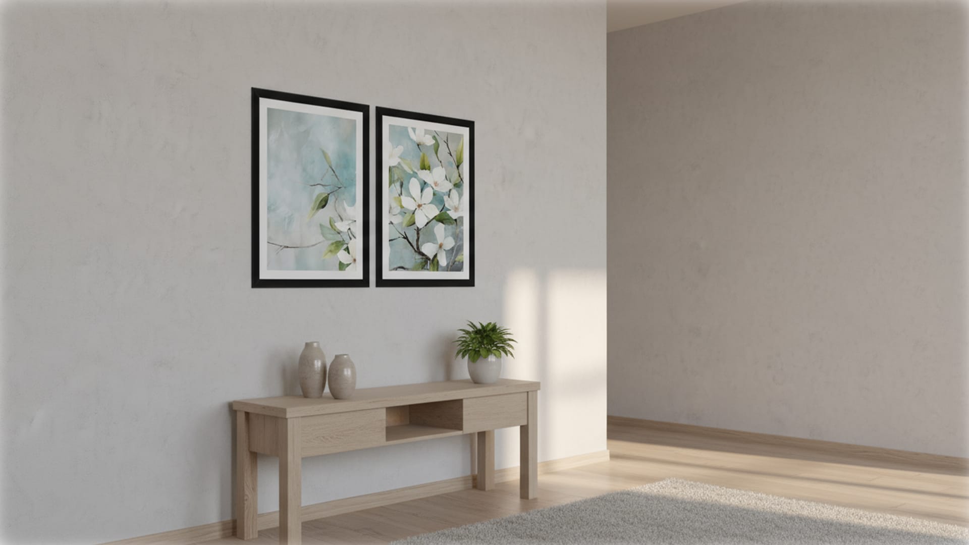 Oprawa: Rekomendujemy minimalistyczne ramy w kolorze białym lub jasnego drewna, które podkreślą świeżość i botaniczny charakter grafik.