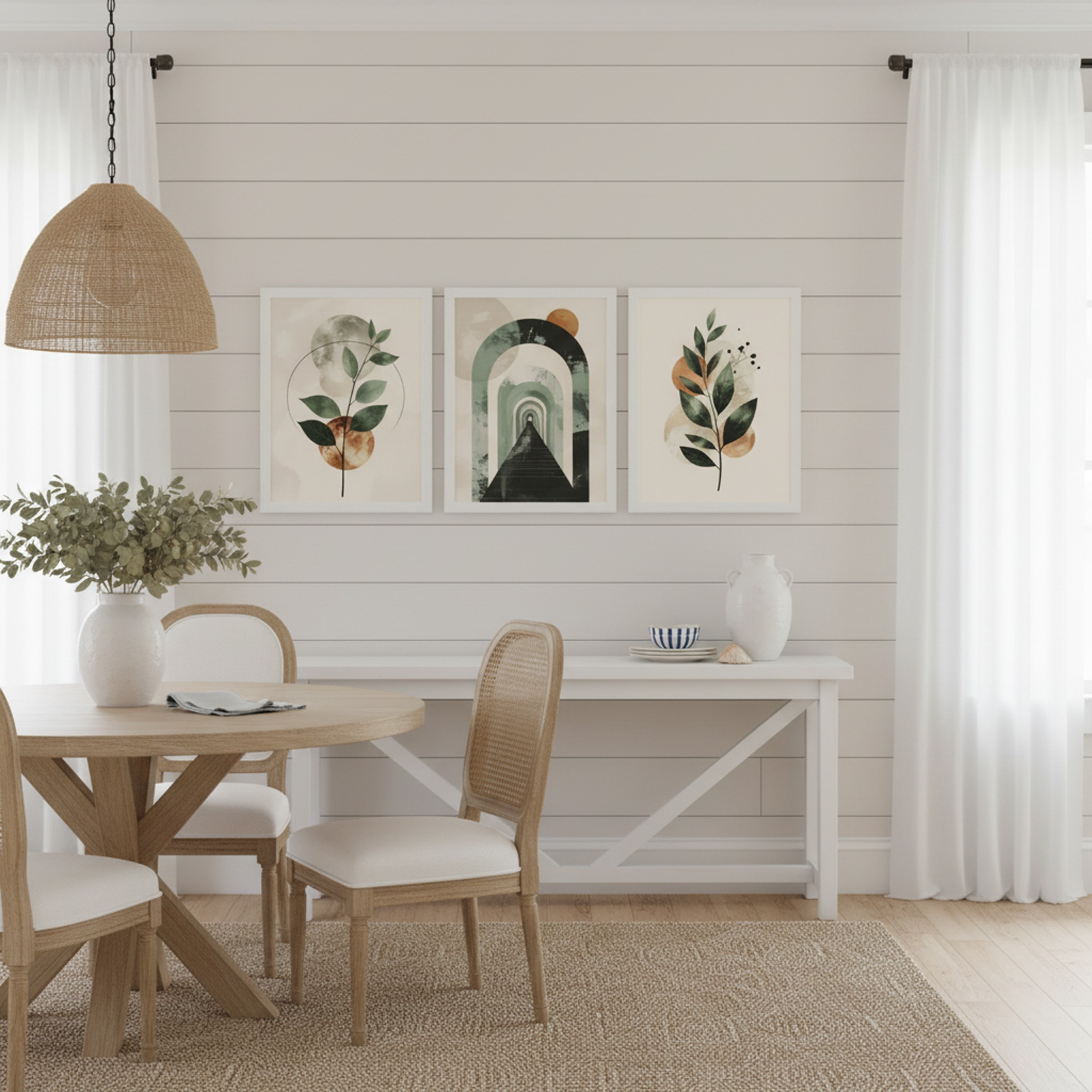 Zestaw 3 plakatów „Geometryczna natura” – arkady, listki i abstrakcja boho