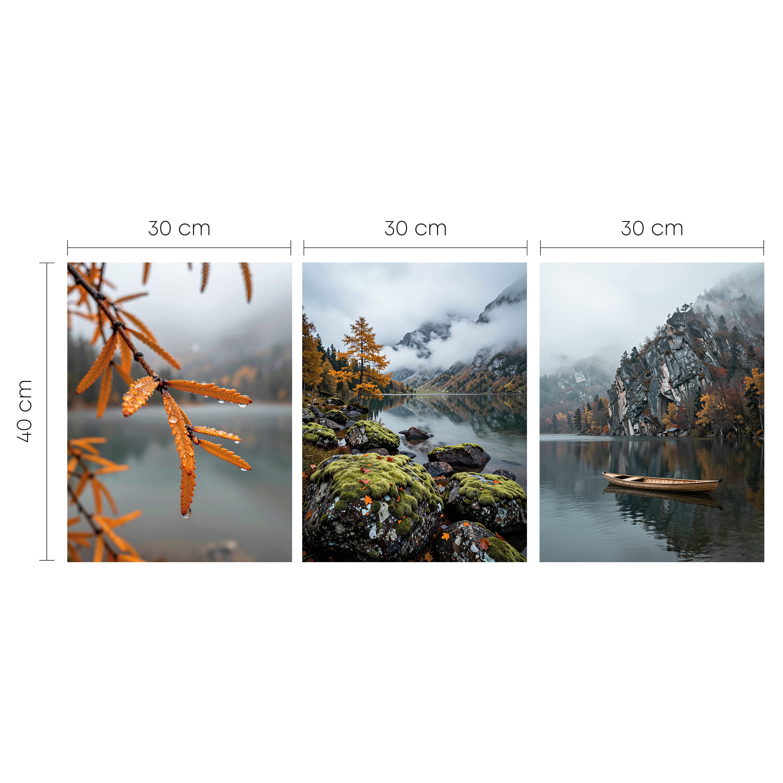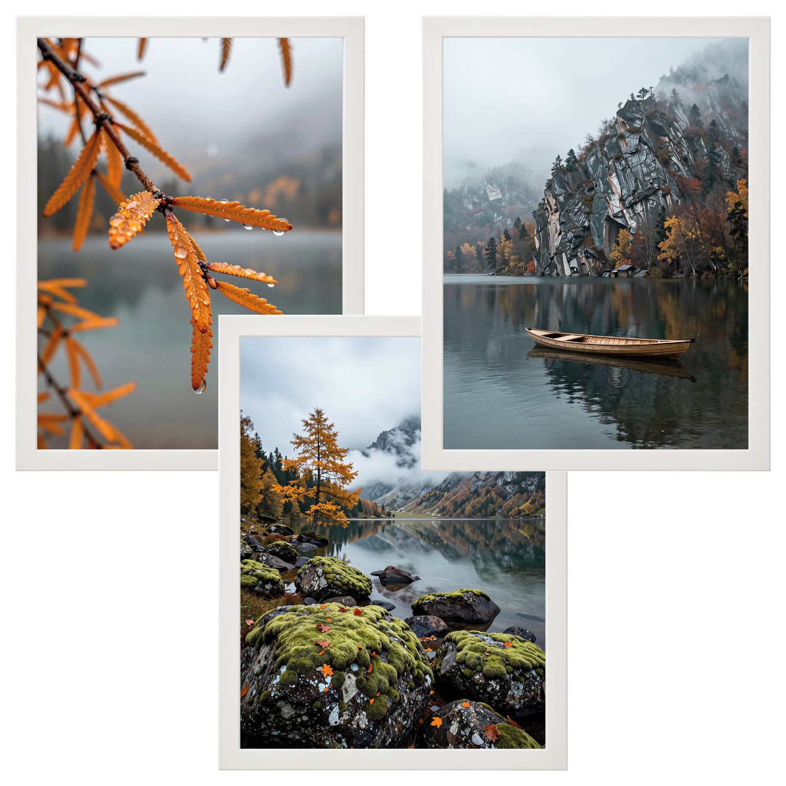 Zestaw 3 plakatów „Jesień nad jeziorem” – mgliste góry, łódź i liście z rosą