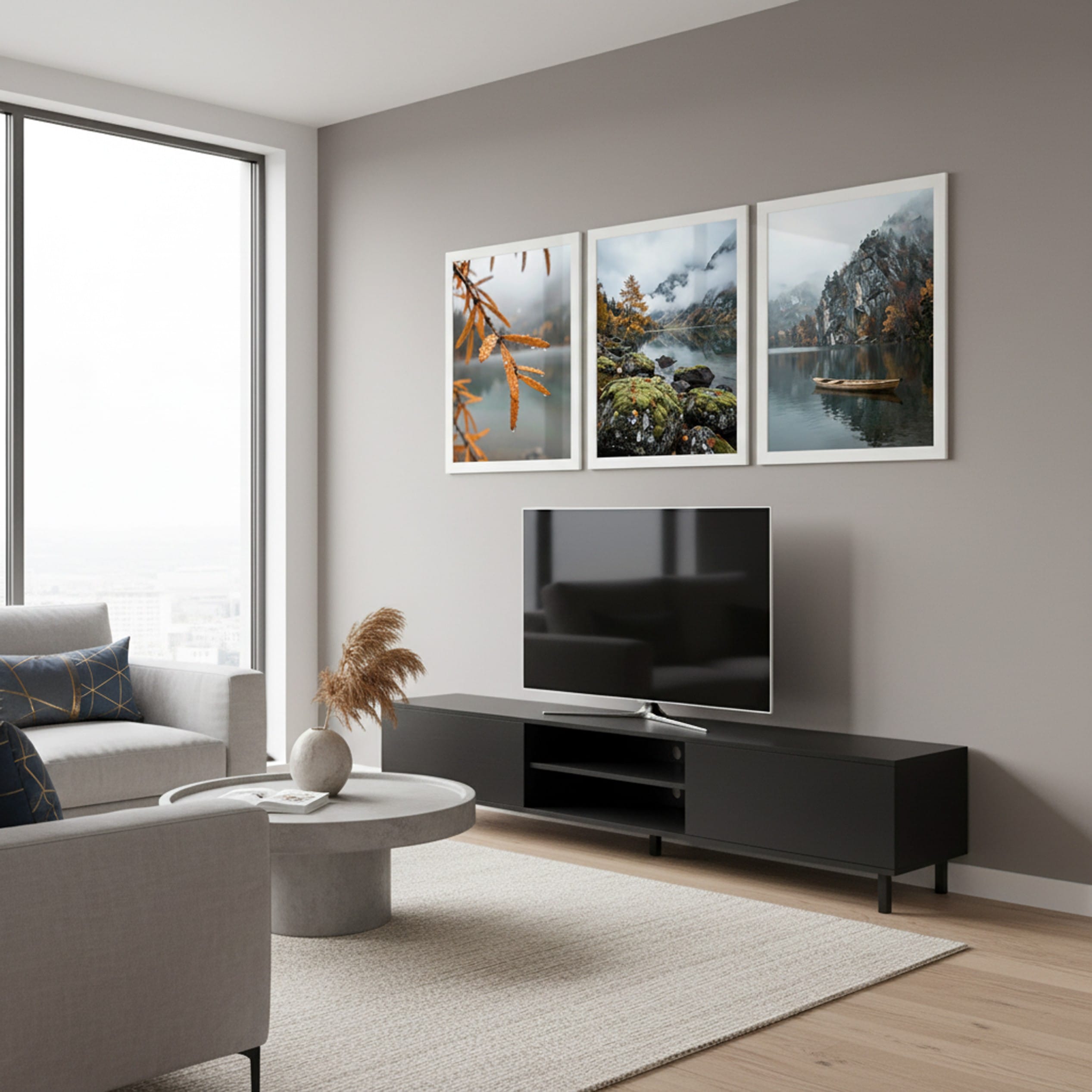 Zestaw „Jesień nad Jeziorem” to kuratorska selekcja fotografii, które przenoszą widza w sam środek dzikiej, górskiej natury. Tryptyk został zaprojektowany tak, aby opowiadać historię o ciszy i detalu: od makro ujęcia gałązki z kroplami deszczu, przez szeroką panoramę jeziora z omszałymi głazami, aż po minimalistyczny kadr z tradycyjną łodzią. To dekoracja, która wycisza i nadaje wnętrzu głębi.