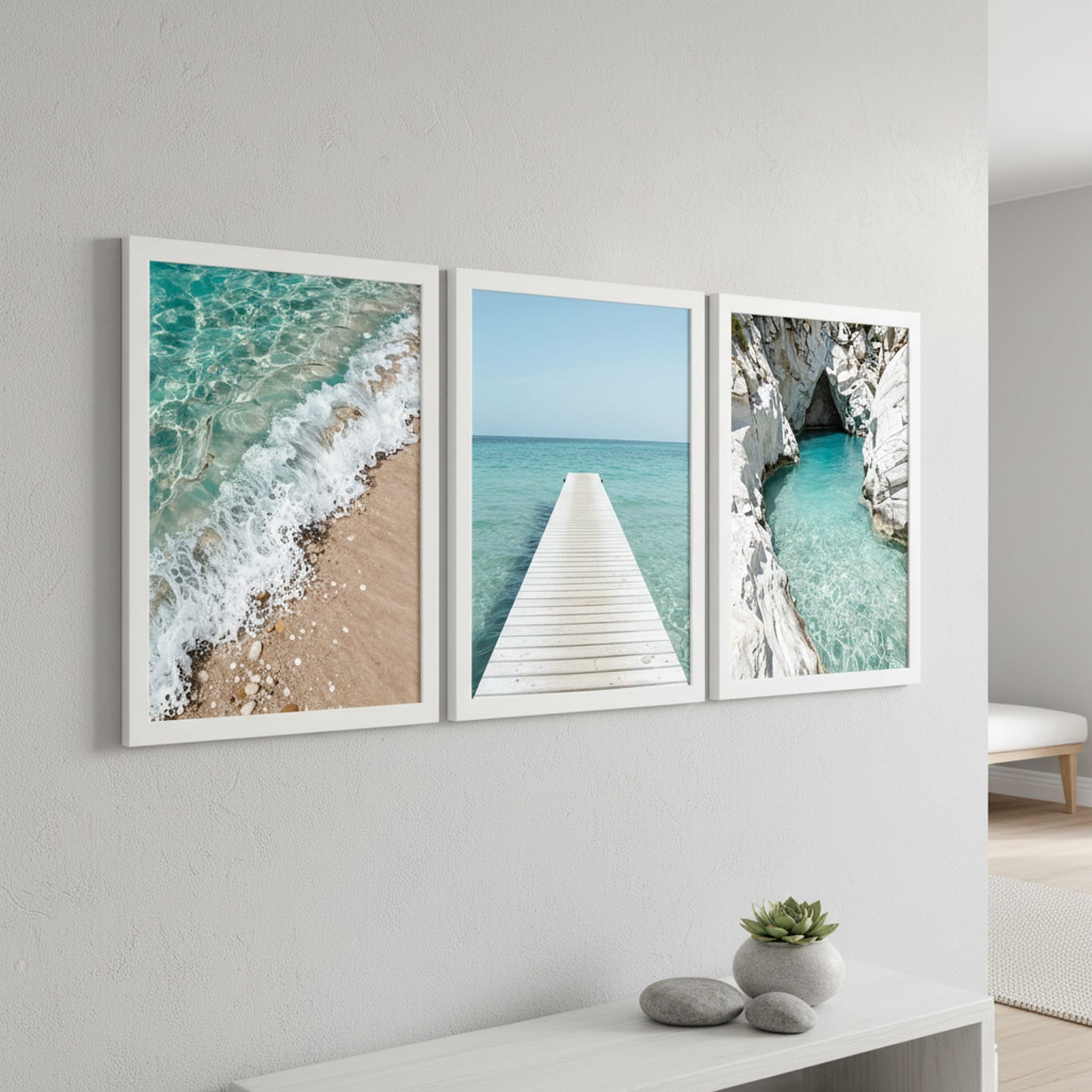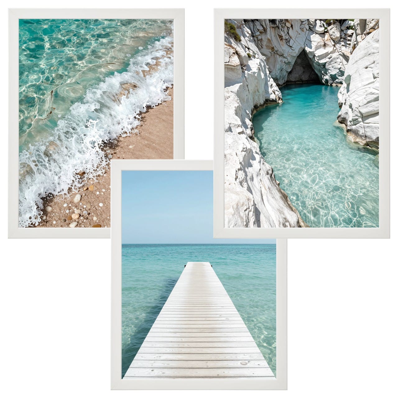 Szukasz dekoracji, która optycznie powiększy przestrzeń i wprowadzi do niej wakacyjną energię? Zestaw „Lazurowa Zatoka” to okno na najpiękniejsze zakątki wybrzeża. Centralny plakat z białym pomoście tworzy niesamowity efekt głębi, prowadząc wzrok ku linii horyzontu. Towarzyszące mu ujęcia – detal morskiej piany oraz przejrzysta woda w skalnej zatoce – dopełniają tę kojącą, błękitną opowieść.