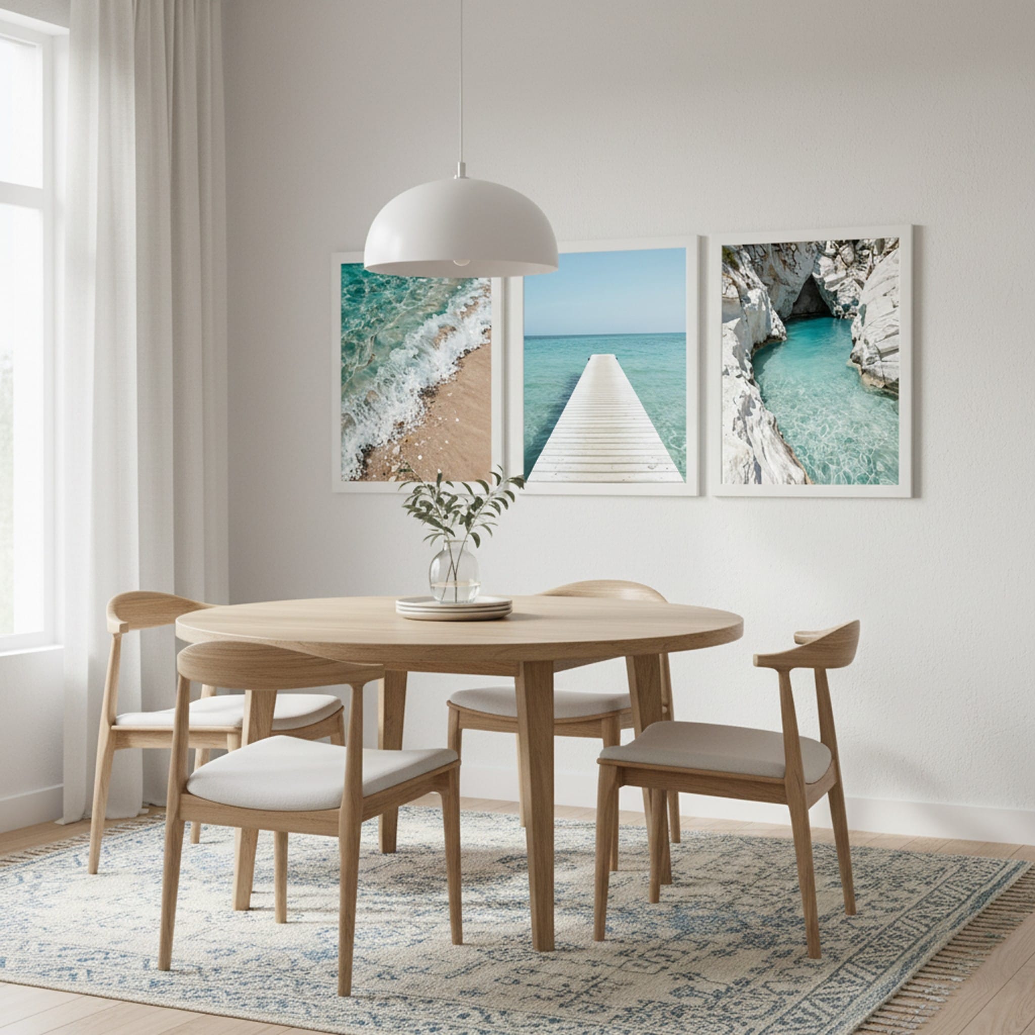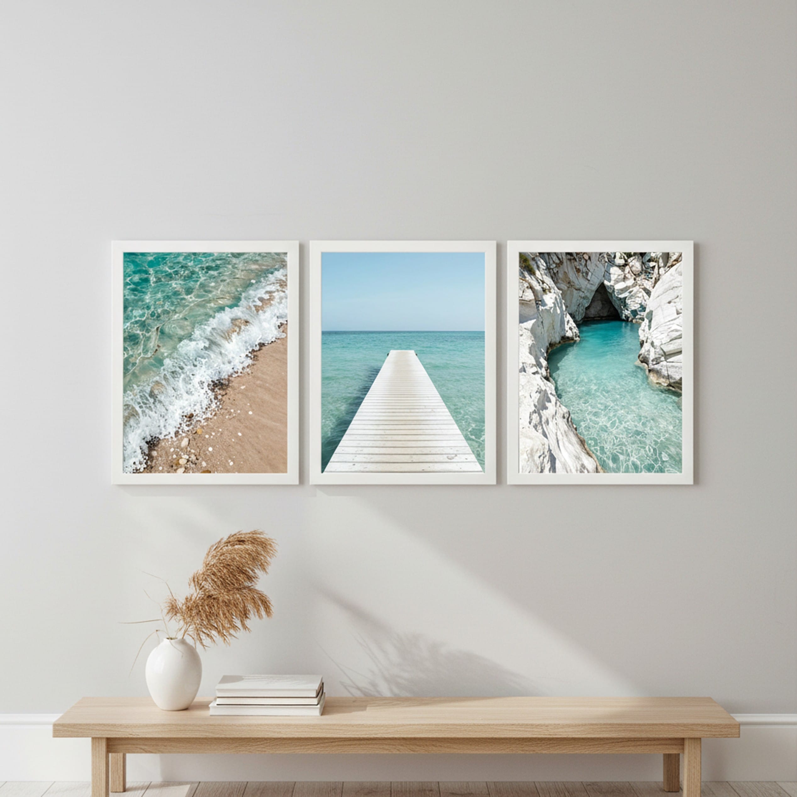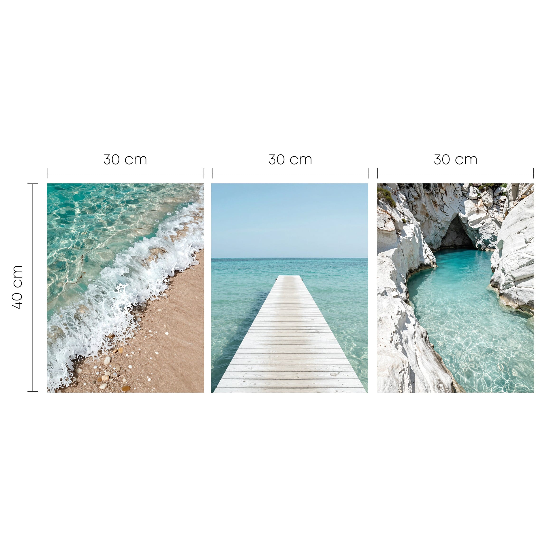 Poczuj wolność i spokój płynący z bezkresu wody. Zestaw „Lazurowa Zatoka” to tryptyk, który rozświetli Twoje wnętrze czystym błękitem i ciepłym blaskiem słońca. Połączenie piaszczystej plaży, białego molo oraz malowniczej groty skalnej tworzy harmonijną całość, idealną do nowoczesnych salonów i łazienek w stylu Beach House. Wydruk klasy premium na papierze Luster 260g.
