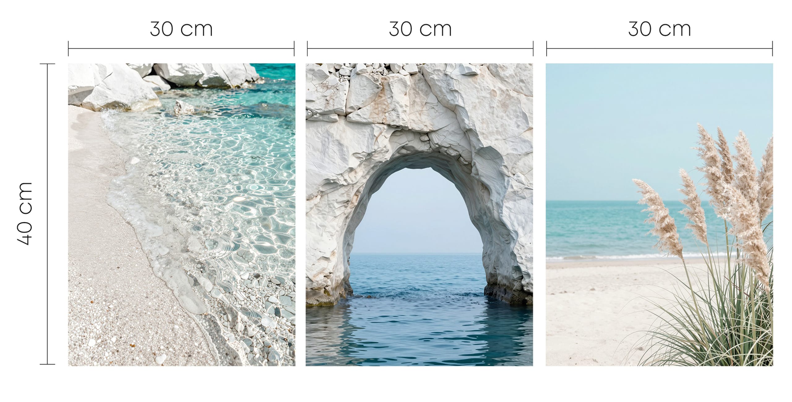 Zestaw 3 plakatów „Lazurowe wybrzeże” – łuk skalny, plaża i trawy nad morzem