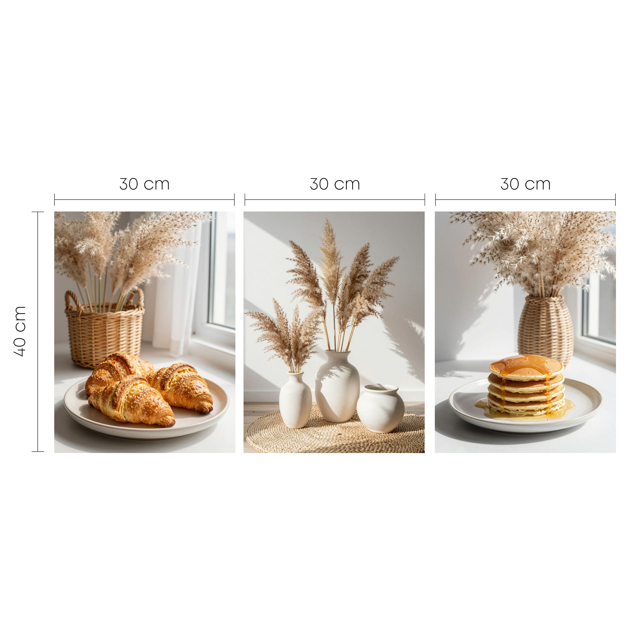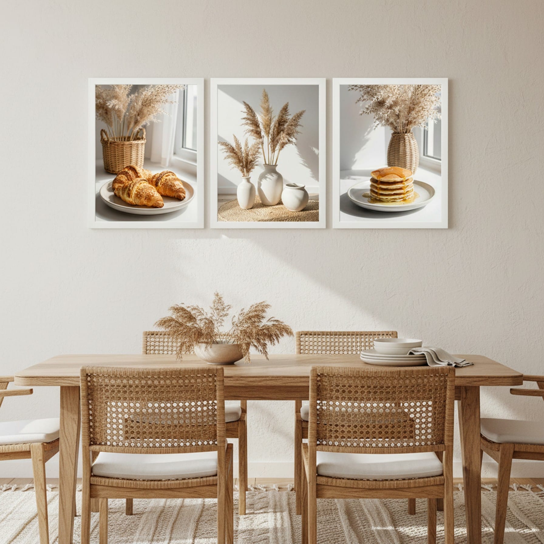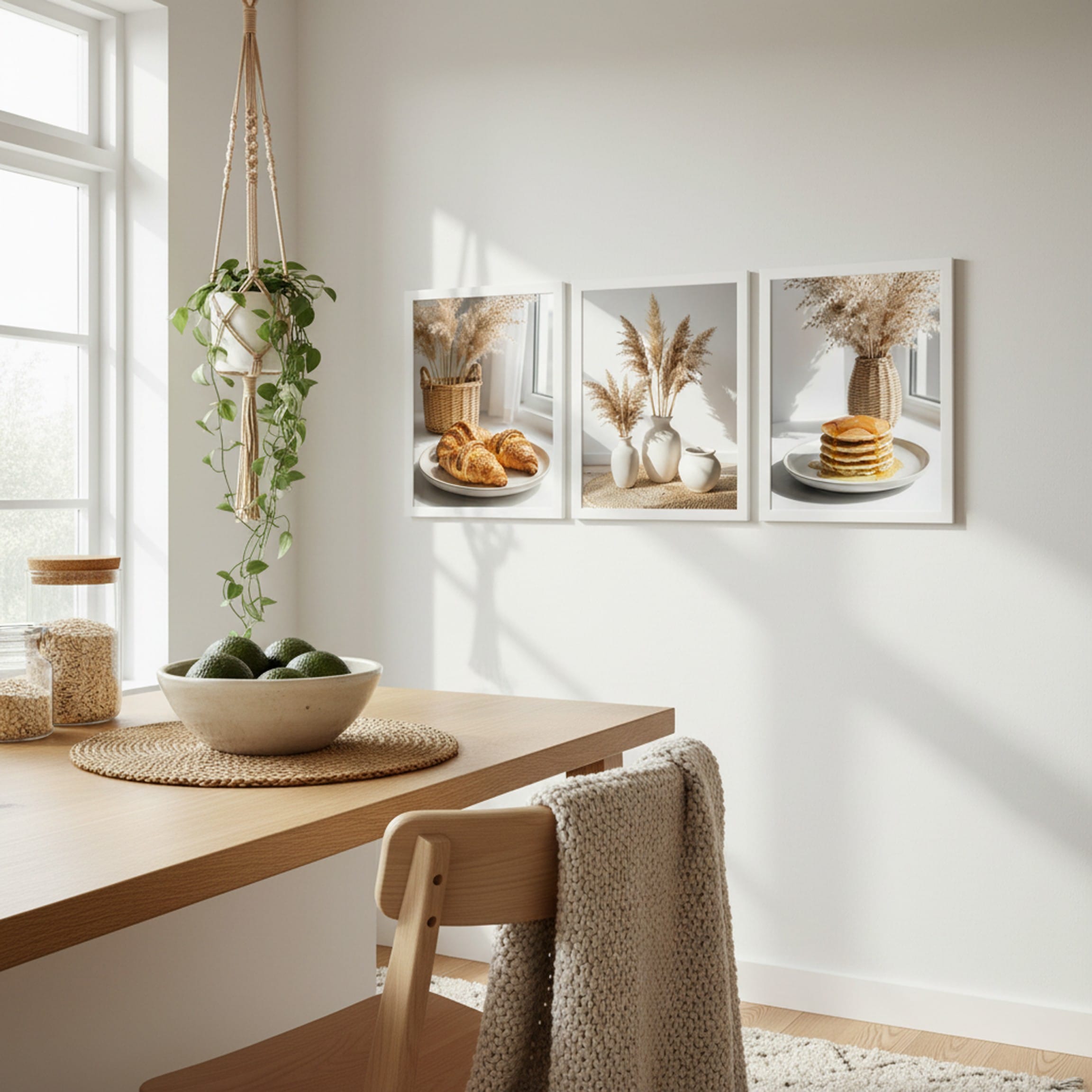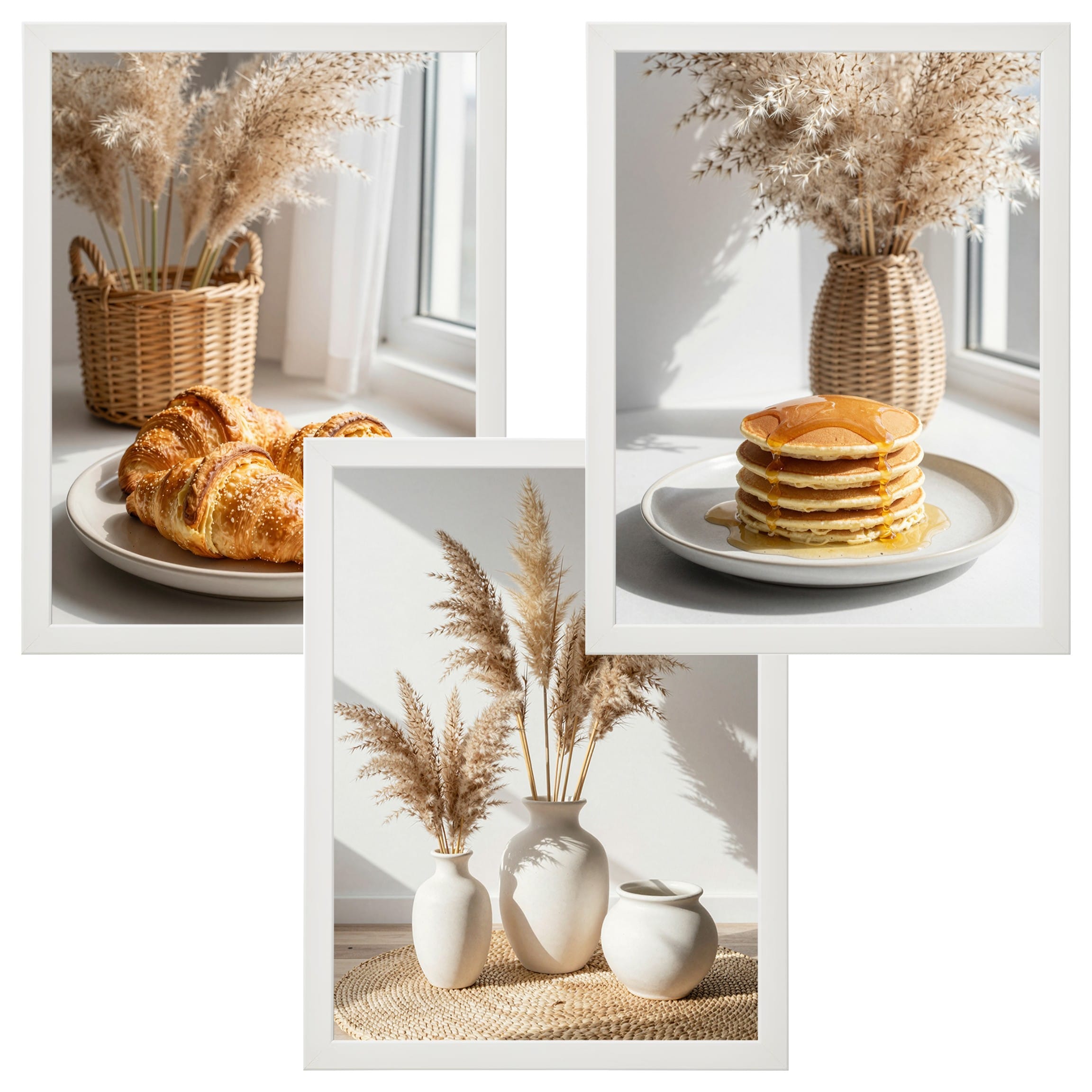 Zestaw „Morski Spokój” to hołd dla naturalnego piękna wybrzeża i estetyki Slow Life. Centralny punkt galerii – kładka prowadząca prosto do błękitnej wody – symbolizuje wolność i relaks. Dopełniają go dwa plakaty z motywami roślinnymi: puszyste trawy pampasowe w ażurowym koszu oraz zbliżenie na złociste kłosy, które wprowadzają do wnętrza miękkość i teksturę. To zestaw, który optycznie powiększa pomieszczenie i nadaje mu świeżości.