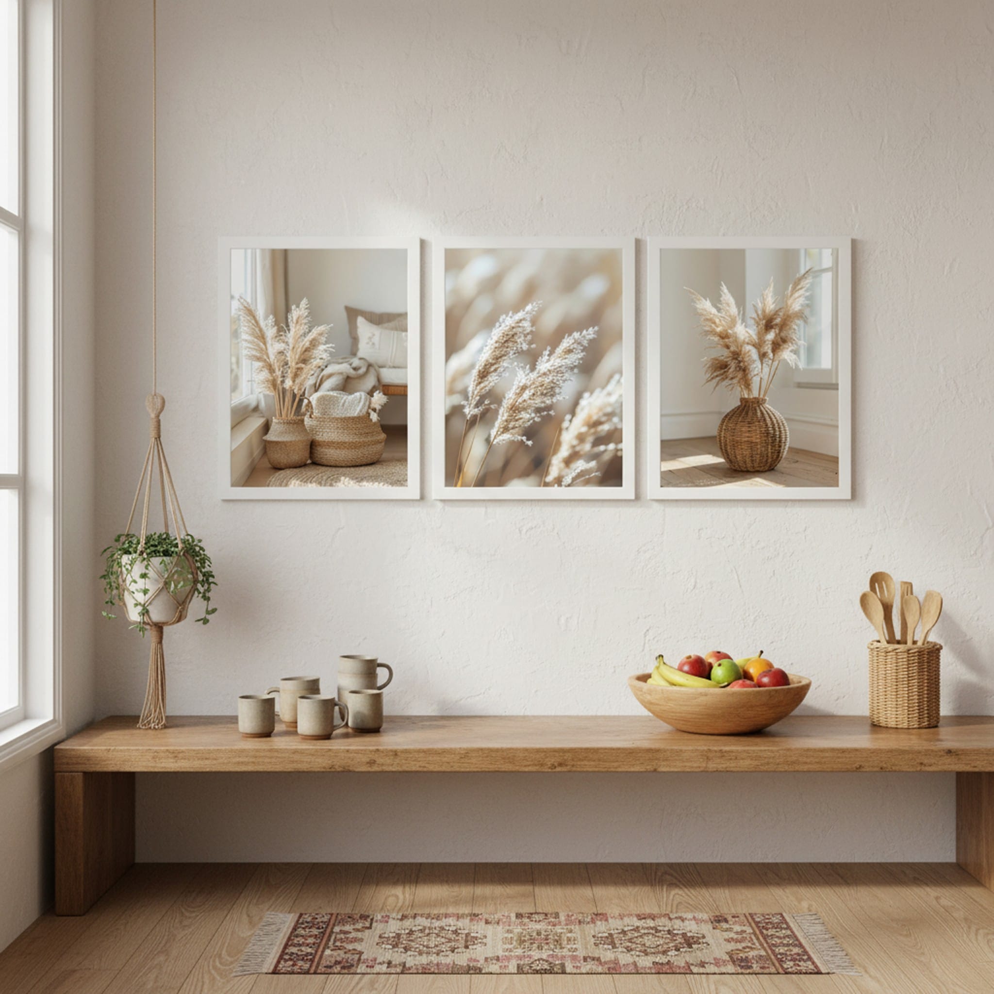 Zestaw „Pampasowy Poranek” to gotowa kompozycja dla miłośników wnętrz pełnych oddechu i naturalnego wdzięku. Tryptyk został zaprojektowany tak, aby prowadzić wzrok od ogólnego nastroju przytulnego wnętrza, przez architektoniczną formę roślin, aż po najdrobniejszy detal puszystych kłosów. Dzięki dominacji jasnych barw i motywów roślinnych, galeria ta optycznie powiększa przestrzeń i nadaje jej nowoczesny, a zarazem sielski charakter.