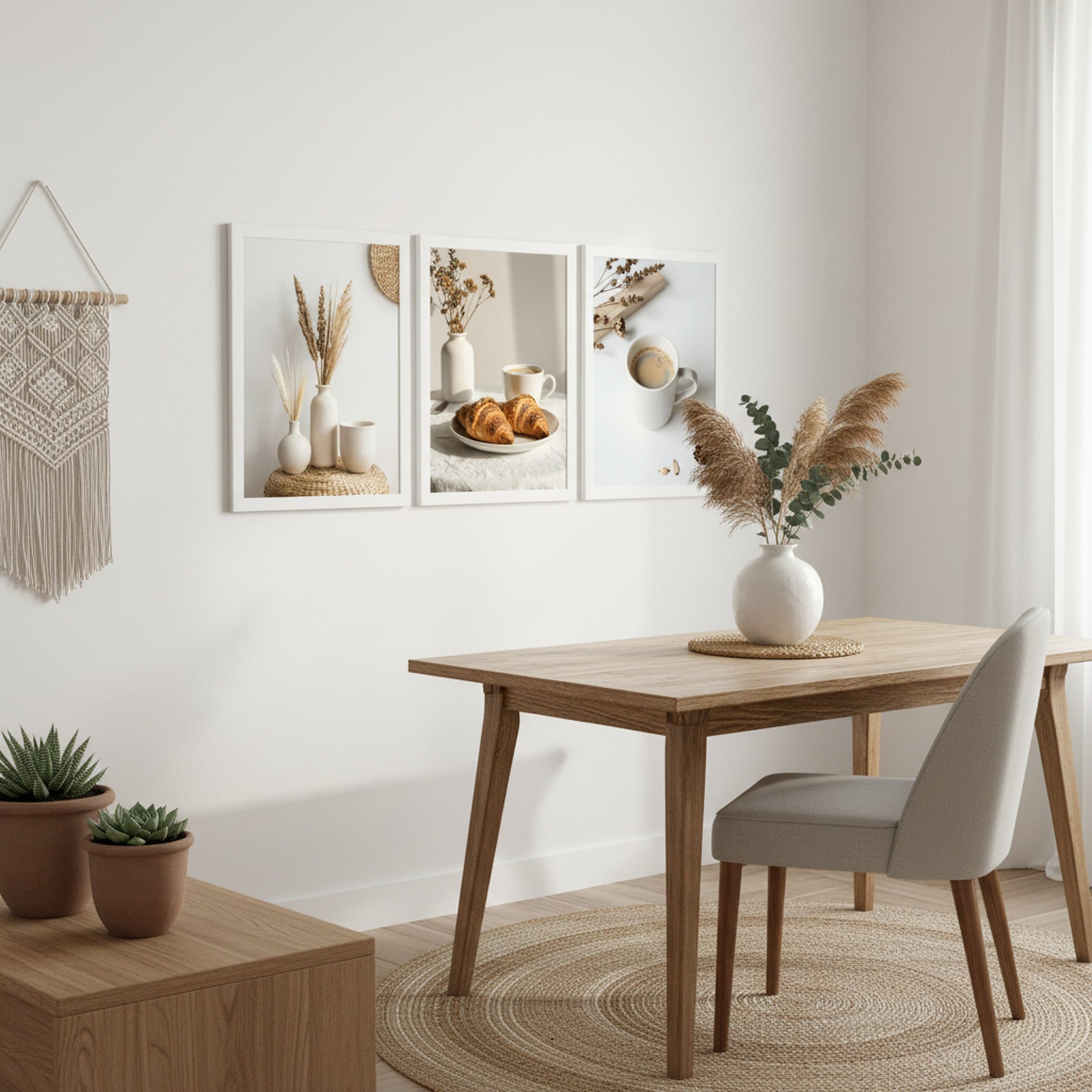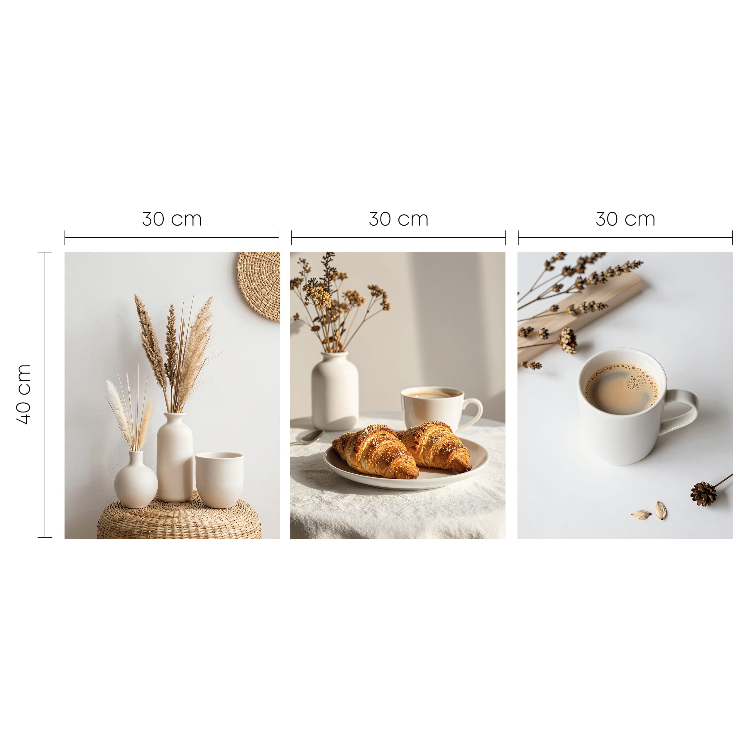 Zestaw 3 plakatów „Poranna harmonia” – kawa, croissanty i trawy w stylu scandi boho