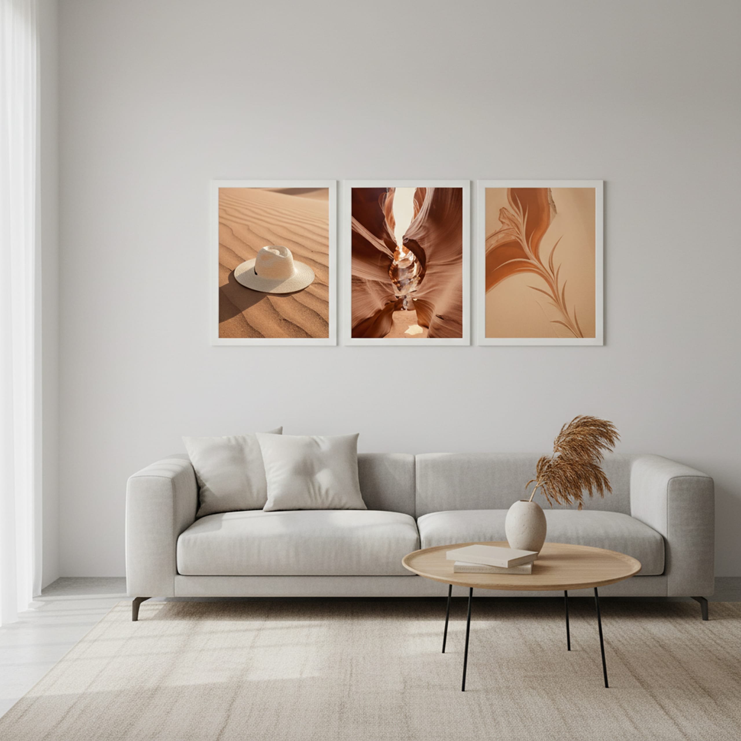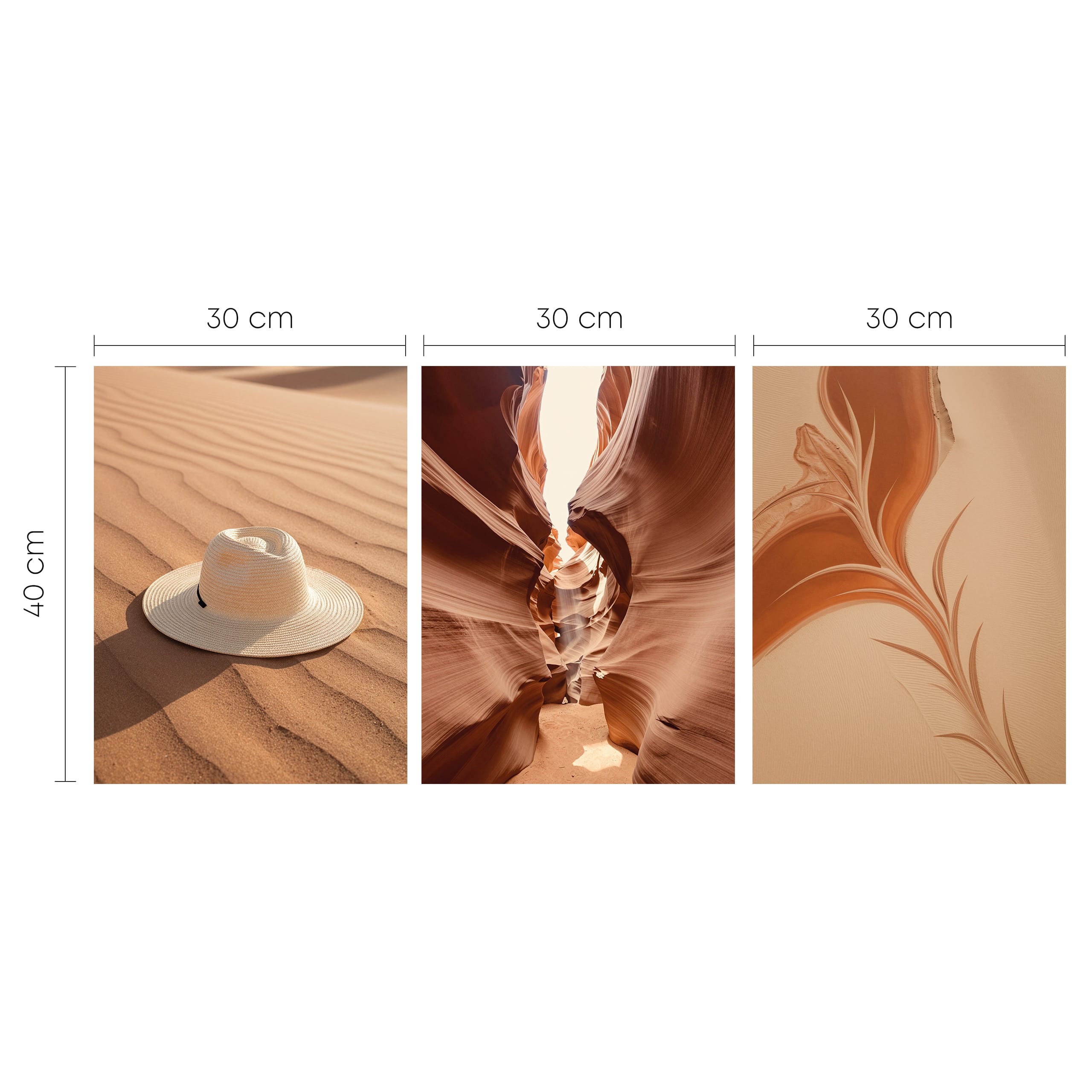 Zestaw 3 plakatów „Pustynna przygoda” – kapelusz na wydmach, kanion antylopy i piaskowe wzory
