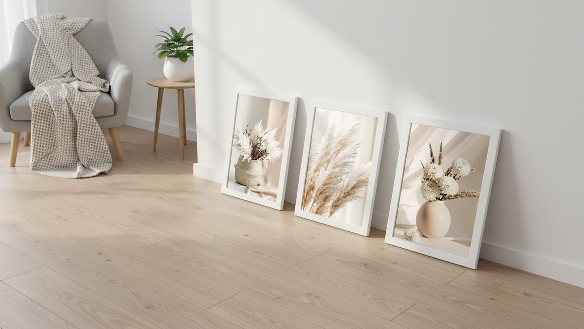 Zestaw „Puszyste Boho” to kuratorski wybór trzech fotografii, które razem tworzą nastrojową galerię pełną lekkości. Tryptyk celebruje styl Modern Organic, zestawiając puszystość pióropuszy traw pampasowych z geometryczną prostotą wazonów i delikatnością płatków dalii. Jasne, kremowe tła i gra cieni sprawiają, że dekoracja ta nie przyłacza wnętrza, lecz dodaje mu elegancji i przytulnego sznytu.
