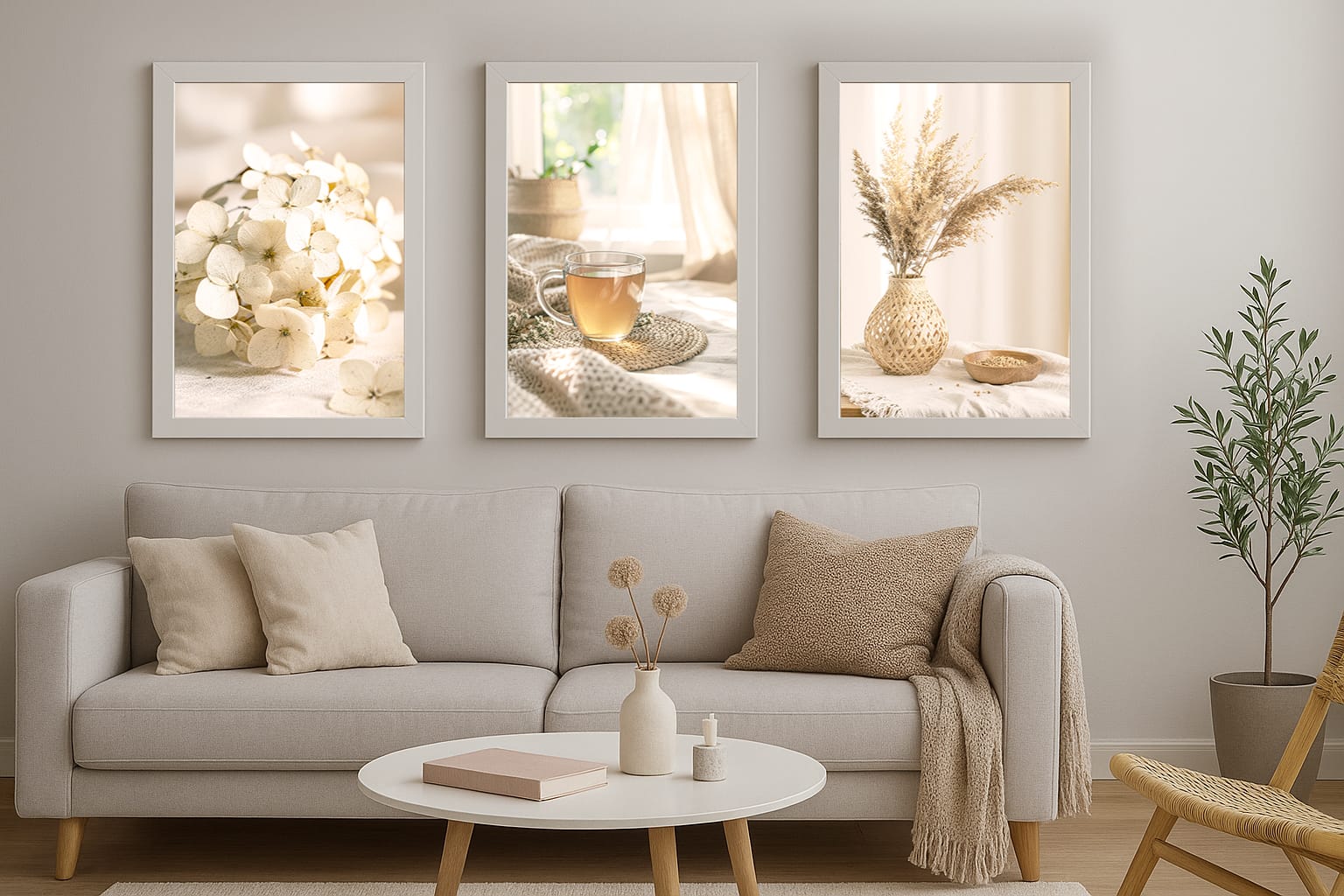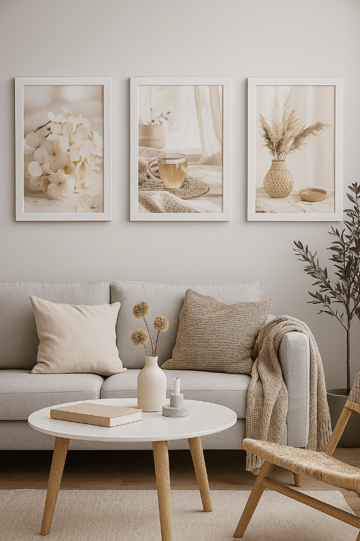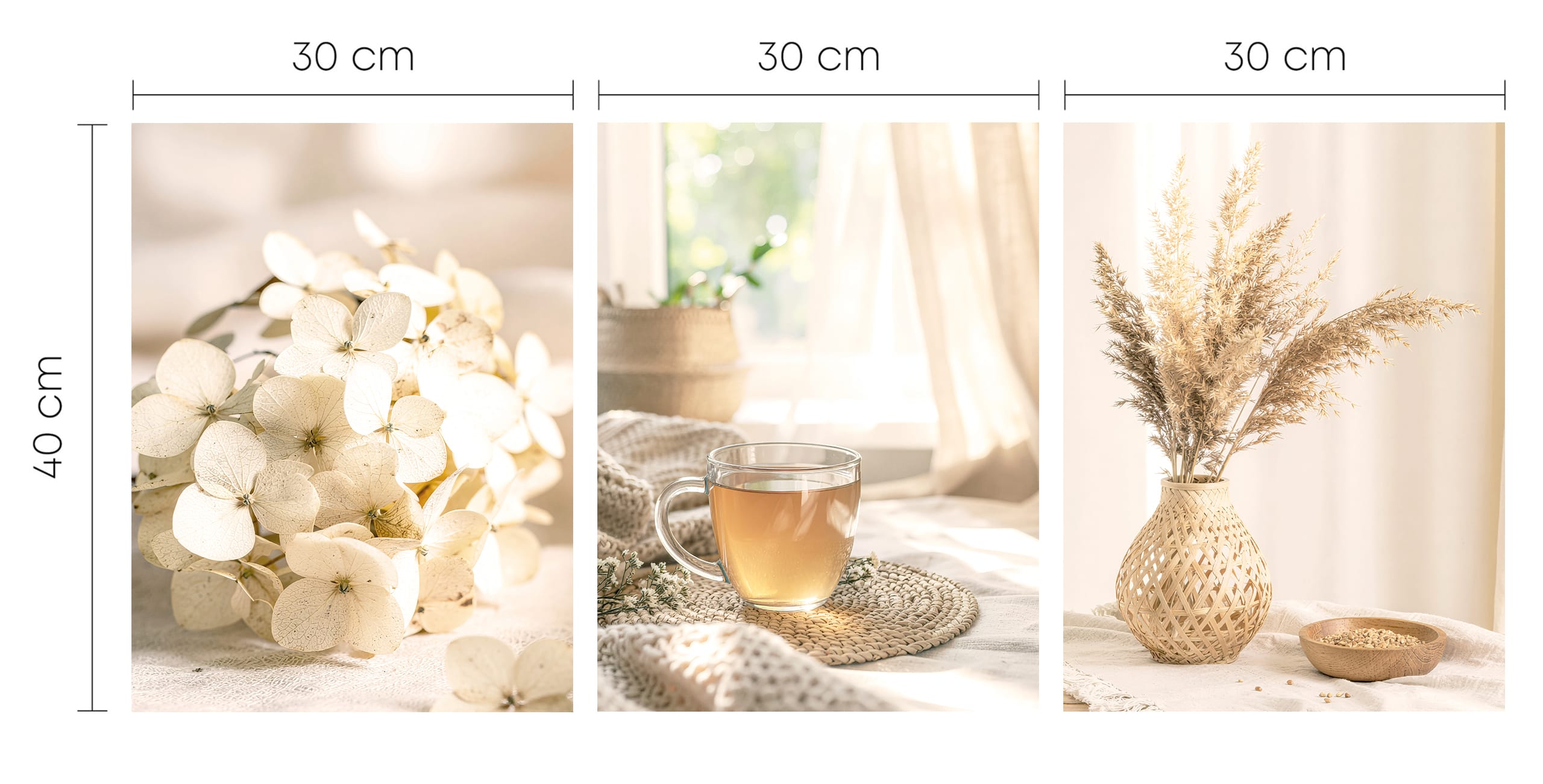 Zestaw „Słoneczny Relaks” to propozycja dla osób, które chcą stworzyć we wnętrzu atmosferę wyciszenia i naturalnej elegancji. Tryptyk składa się z trzech uzupełniających się kadrów: zbliżenia na delikatne kwiaty hortensji, filiżanki herbaty na plecionej podkładce oraz puszystych traw pampasowych w ażurowym wazonie. Spójna paleta barw ziemi sprawia, że galeria ta optycznie rozjaśnia pomieszczenie i nadaje mu nowoczesny, organiczny sznyt.