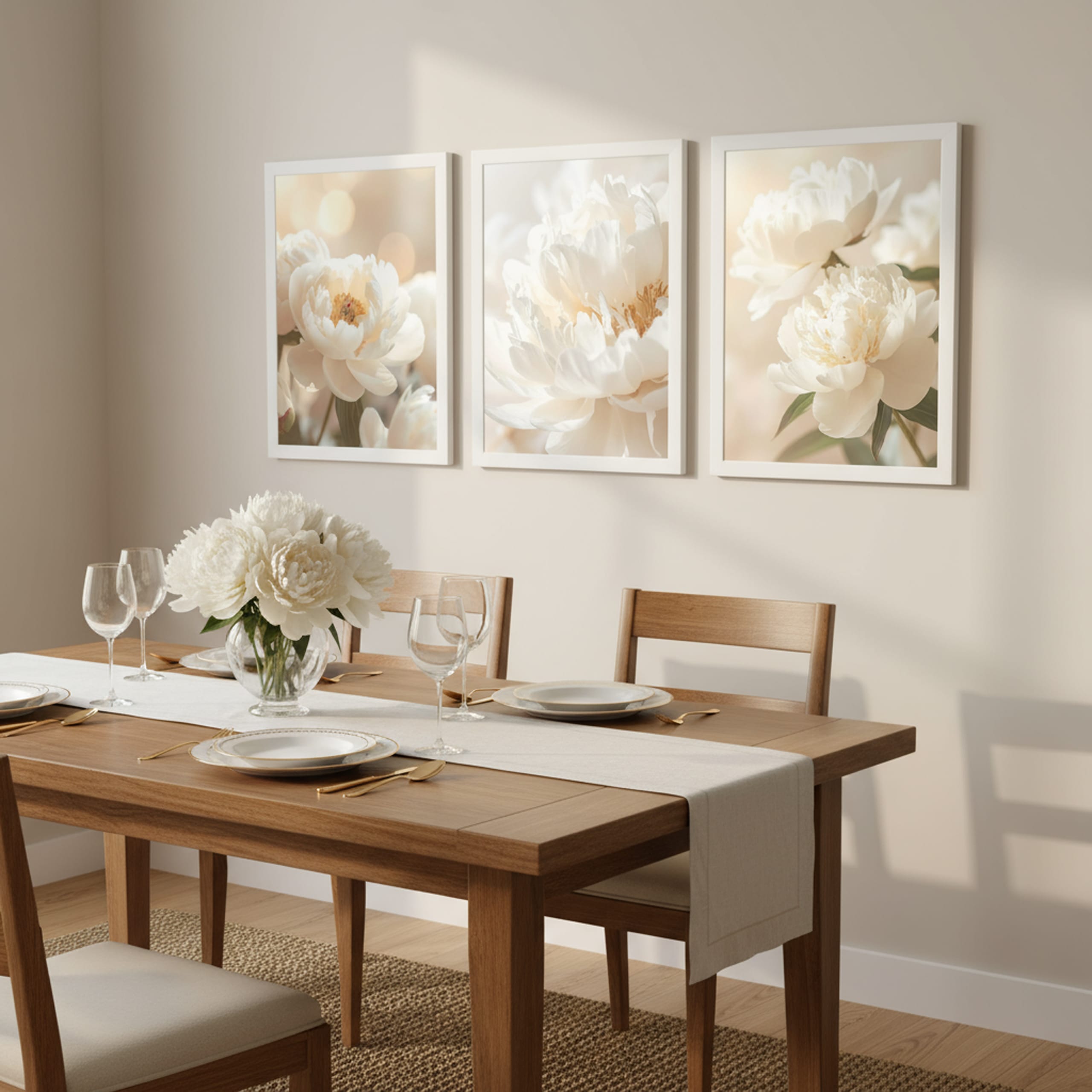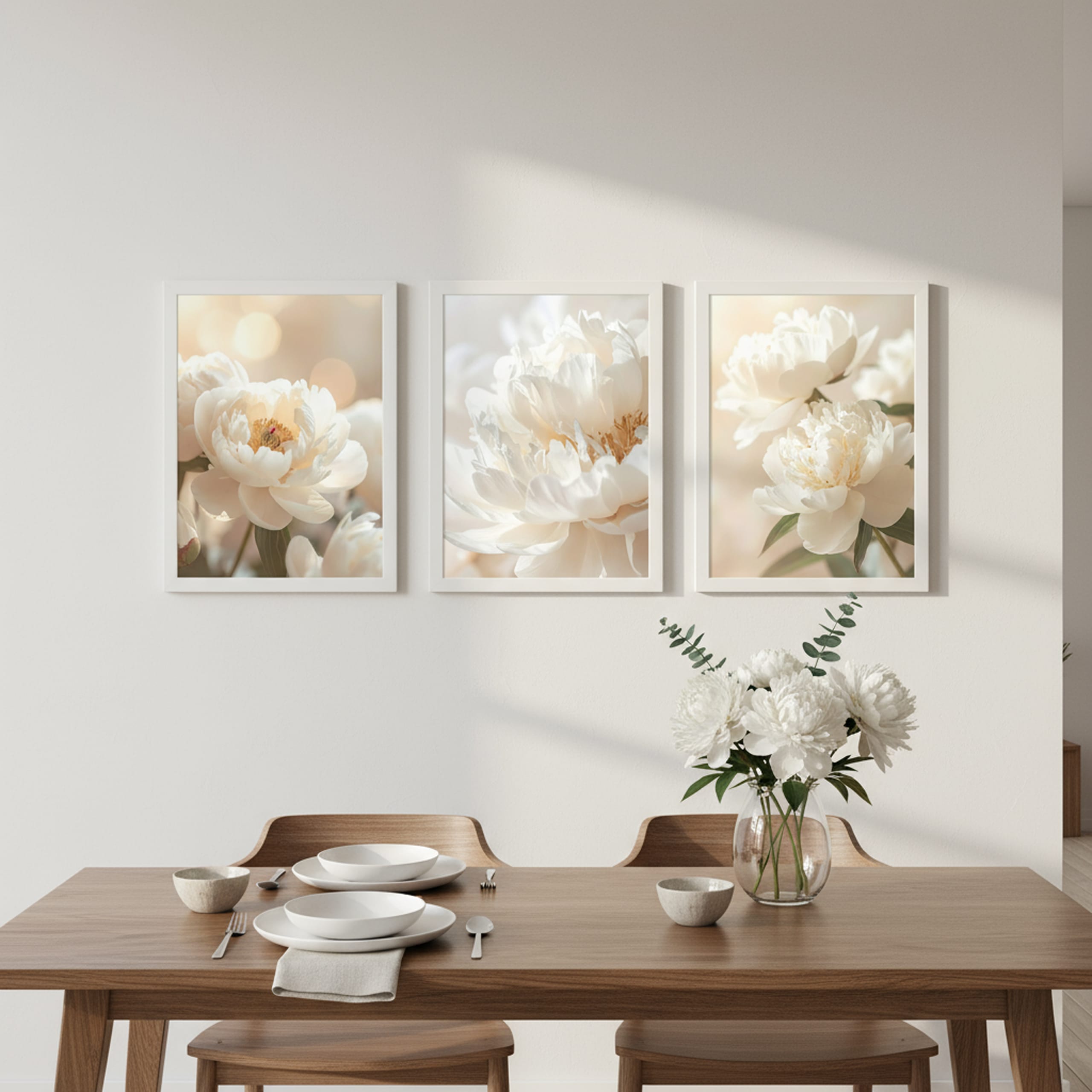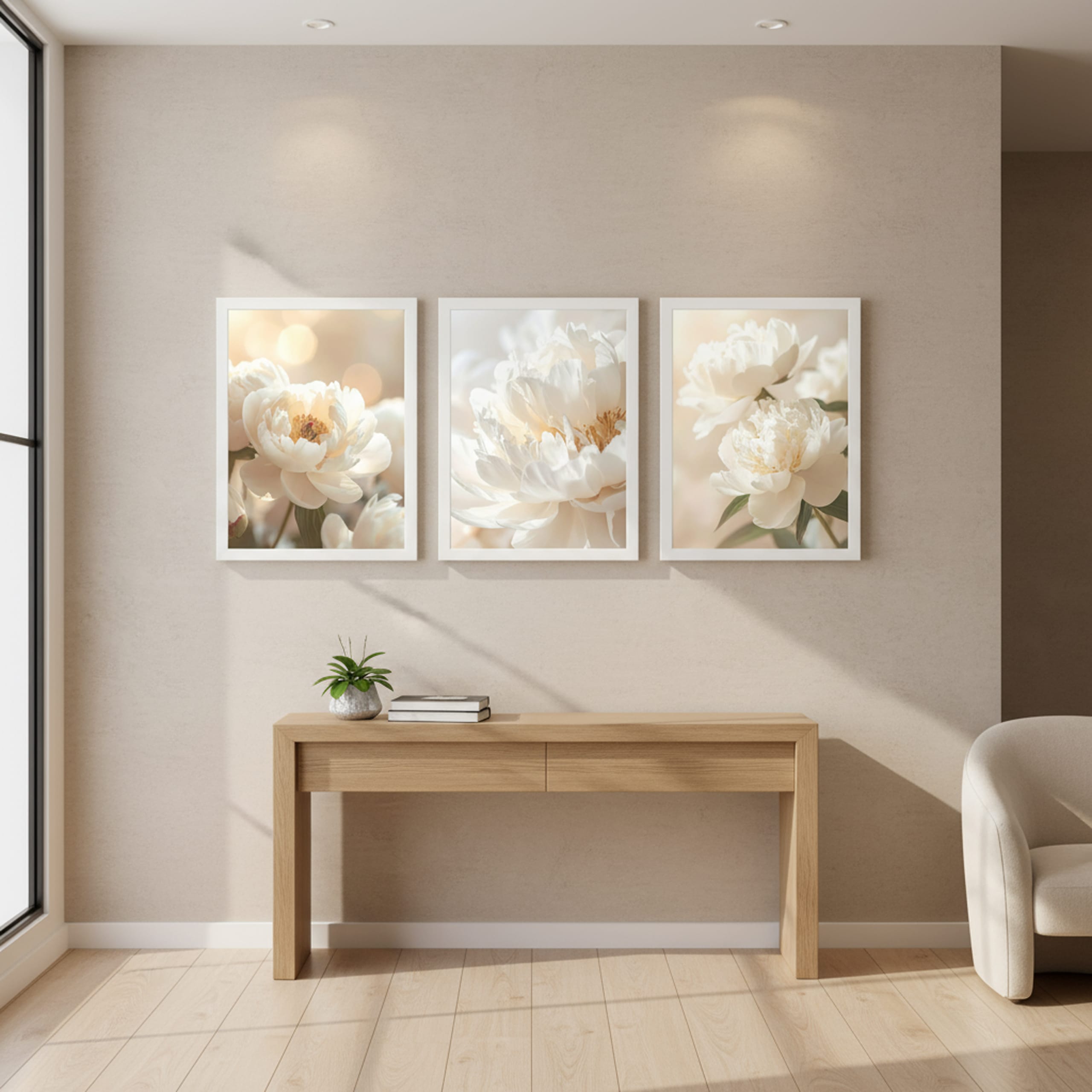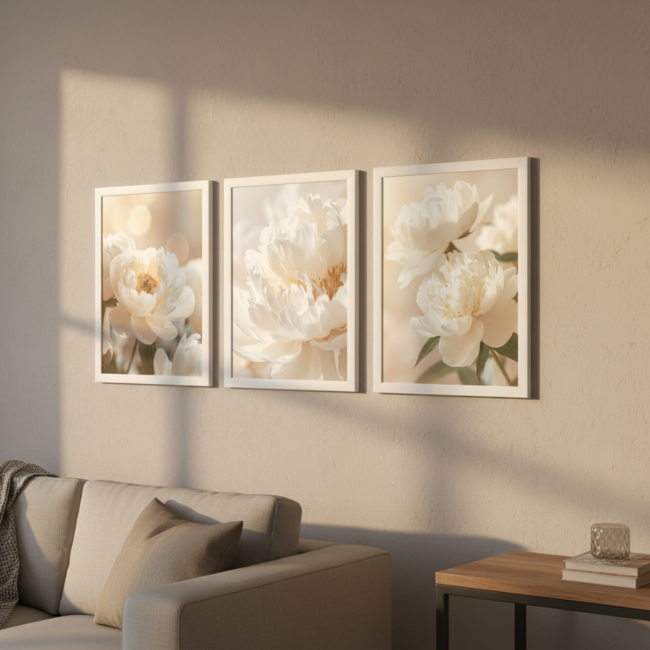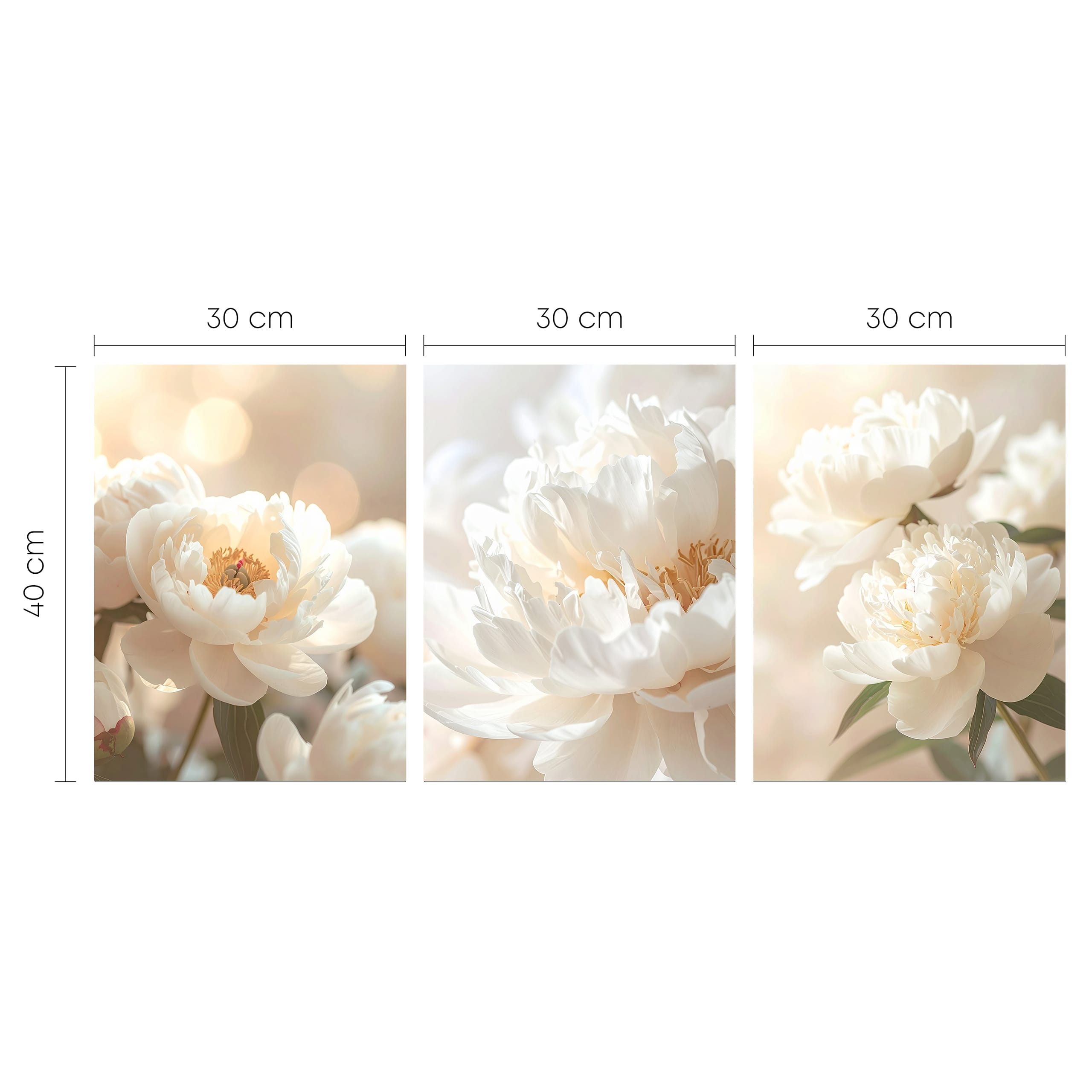 Zestaw 3 plakatów „Złociste piwonie” – białe kwiaty, słoneczny blask i botaniczna elegancja