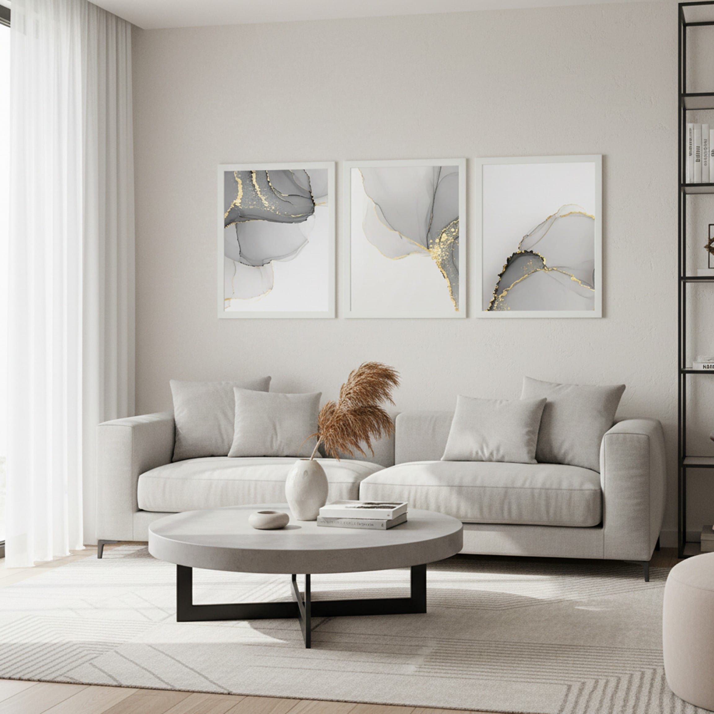 Zestaw „Złoty Marmur” to propozycja dla osób poszukujących dekoracji, która przyciąga wzrok, nie przytłaczając jednocześnie wnętrza. Tryptyk został zaprojektowany tak, aby płynnie przechodzić z jednego plakatu na drugi, tworząc spójną, panoramiczną opowieść o formie i świetle. Kontrast między jasnym tłem a głębokim grafitem, przełamany złotymi drobinkami, nadaje ścianie wyrafinowany charakter.